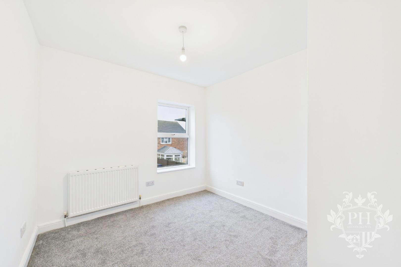 The second bedroom is positioned at the front of the house, catching plenty of natural light through its UPVC double-glazed window. There's enough room for a double bed, though larger wardrobes or storage pieces might be a tight fit. The fresh grey carpet underfoot adds a modern touch, and the newly painted walls make the space feel clean and inviting. A radiator keeps the room warm and comfortable year-round.