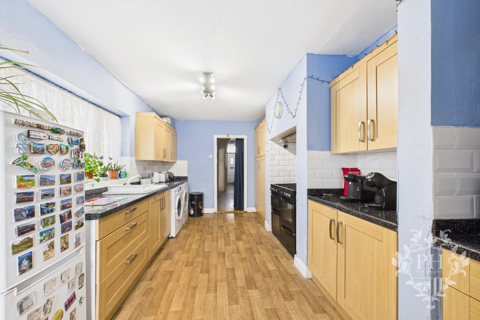 The kitchen is generous in size and is fitted with an array of light wood-effect wall, base, and drawer units, complemented by contrasting dark worktops. There is ample space for freestanding appliances, making the layout both practical and flexible. A window and external door provide natural light and lead directly out to the low-maintenance rear yard. Additional features include a fitted radiator, laminate flooring, and a stylish white brickwork tile splashback, enhancing the kitchen’s bright and functional appeal.