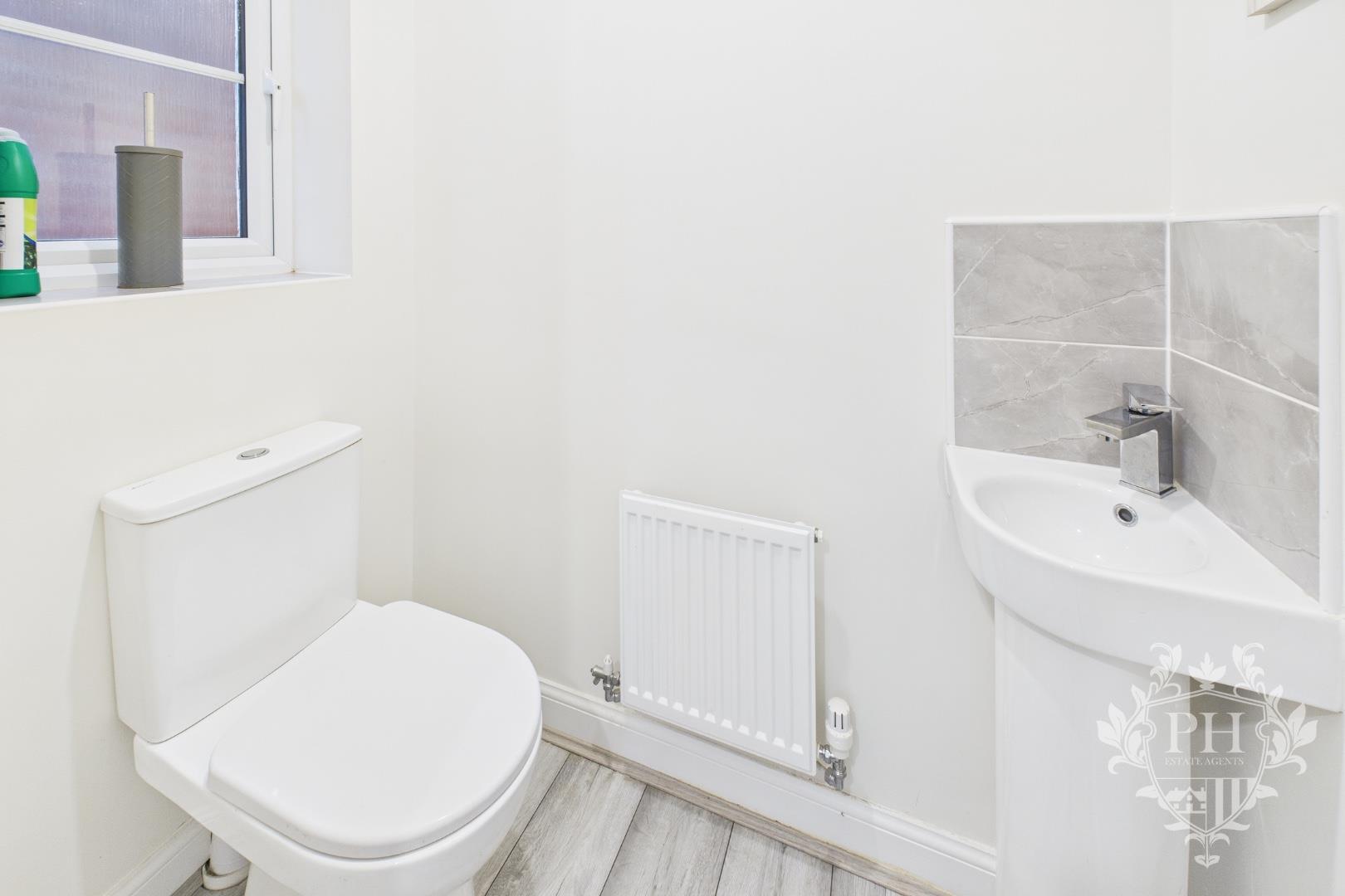 The family bathroom echoes the style of the ensuite, with matching tiles that create a sense of continuity and calm. There’s a full-sized bath for relaxing soaks, a toilet, and a sink with a practical splashback—simple, clean, and easy to maintain. It’s a space designed for everyday life, equally ready for the morning rush or a quiet evening unwind.