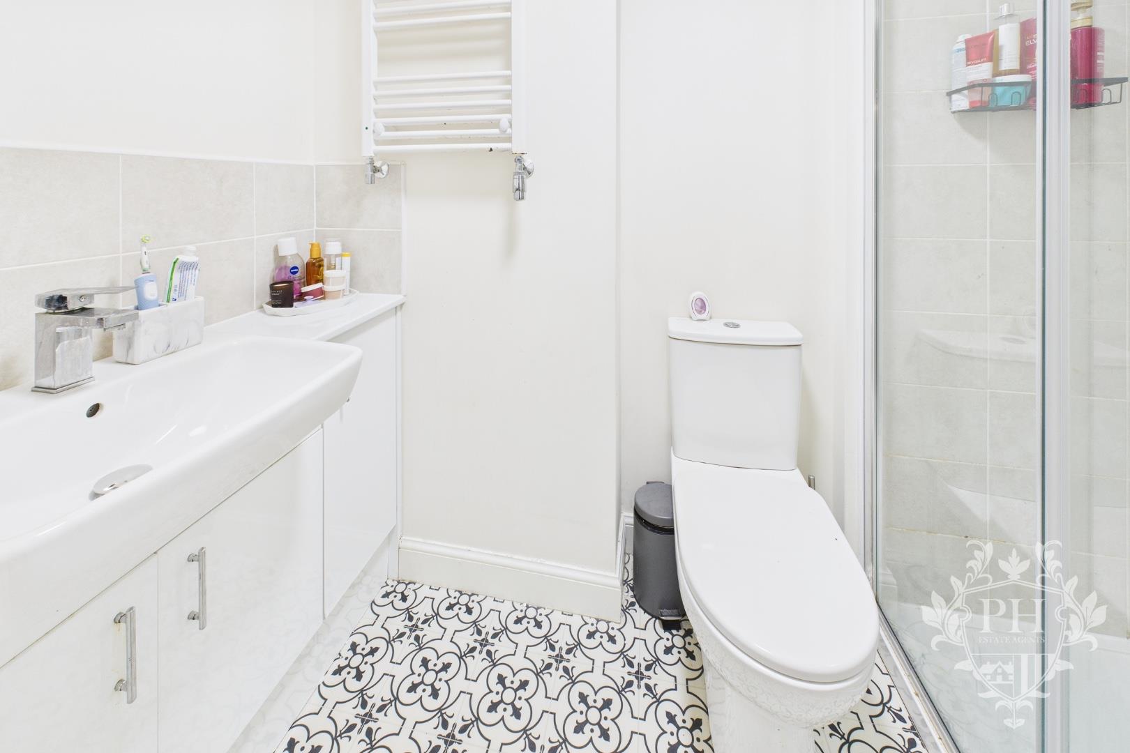The ensuite is a model of modern comfort, featuring a fully tiled shower cubicle that feels clean and contemporary. There’s a toilet and a sink with a neatly tiled splashback—just enough detail to keep things interesting without overwhelming the space. A heated towel rail adds that final touch of luxury, always ready with a warm towel after your shower. It’s compact, private with a well thought lay out.