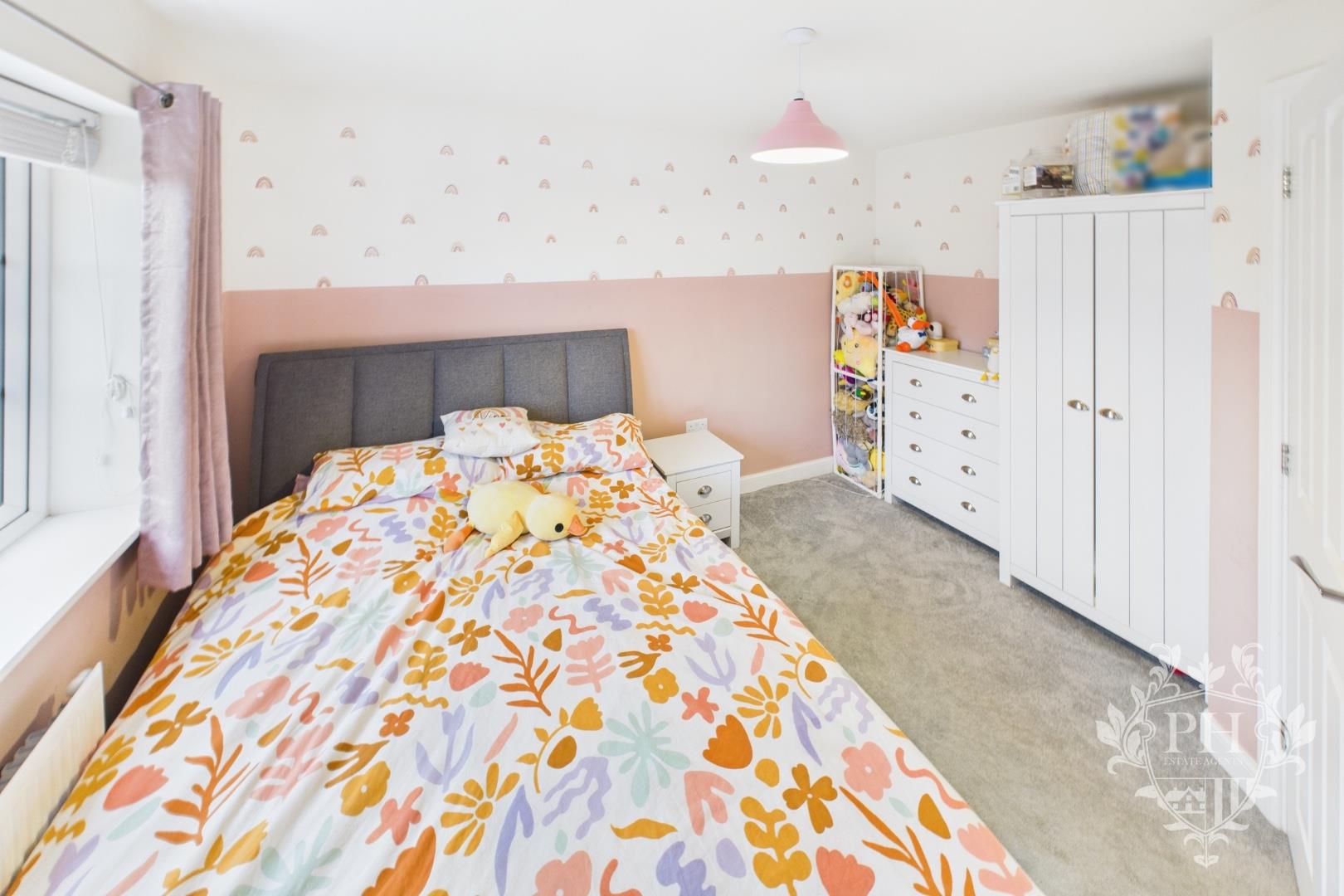 Bedroom three is every little dreamer’s delight, with the bottom half of the walls painted a rich block of pink—bold, cheerful, and unmistakably playful. Above, the white upper walls are dotted with small, scattered rainbows, bringing a touch of magic into the space. It’s a room that feels both bright and cozy, perfectly fit for a princess ready to make it her own kingdom.