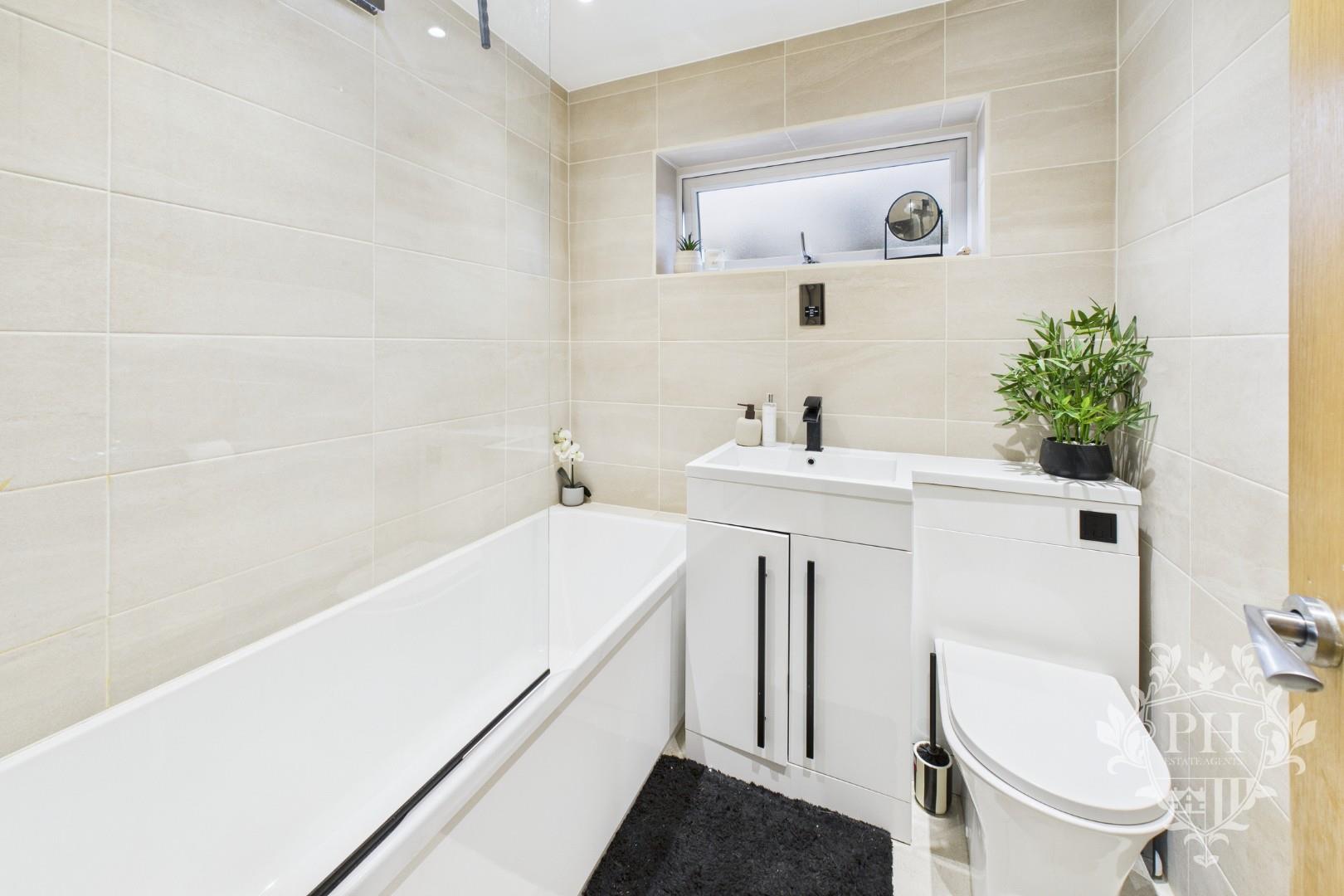 The family bathroom features a sleek, contemporary three-piece suite, complete with a deep paneled bathtub fitted with a rainfall shower and a clear glass screen. A matching hand basin and toilet are set side by side, designed for both style and convenience. Soft, diffused light pours in through a frosted UPVC double-glazed window, offering privacy while keeping the space bright. The walls are lined with glossy tiles, accented by bold black fixtures and accessories, and a modern radiator ensures the room stays warm and comfortable year-round.