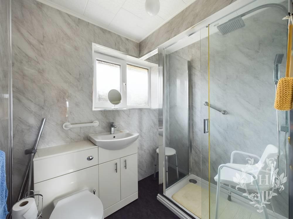 This modern family bathroom consists of a three piece suite which includes a step in shower cubicle with a thermostat shower, combination hand basin & toilet which provides additional storage. This room has been well maintained and benefits from a frosted UPVC double glazed window to the rear aspect and space grey wall cladding making it easy to clean.