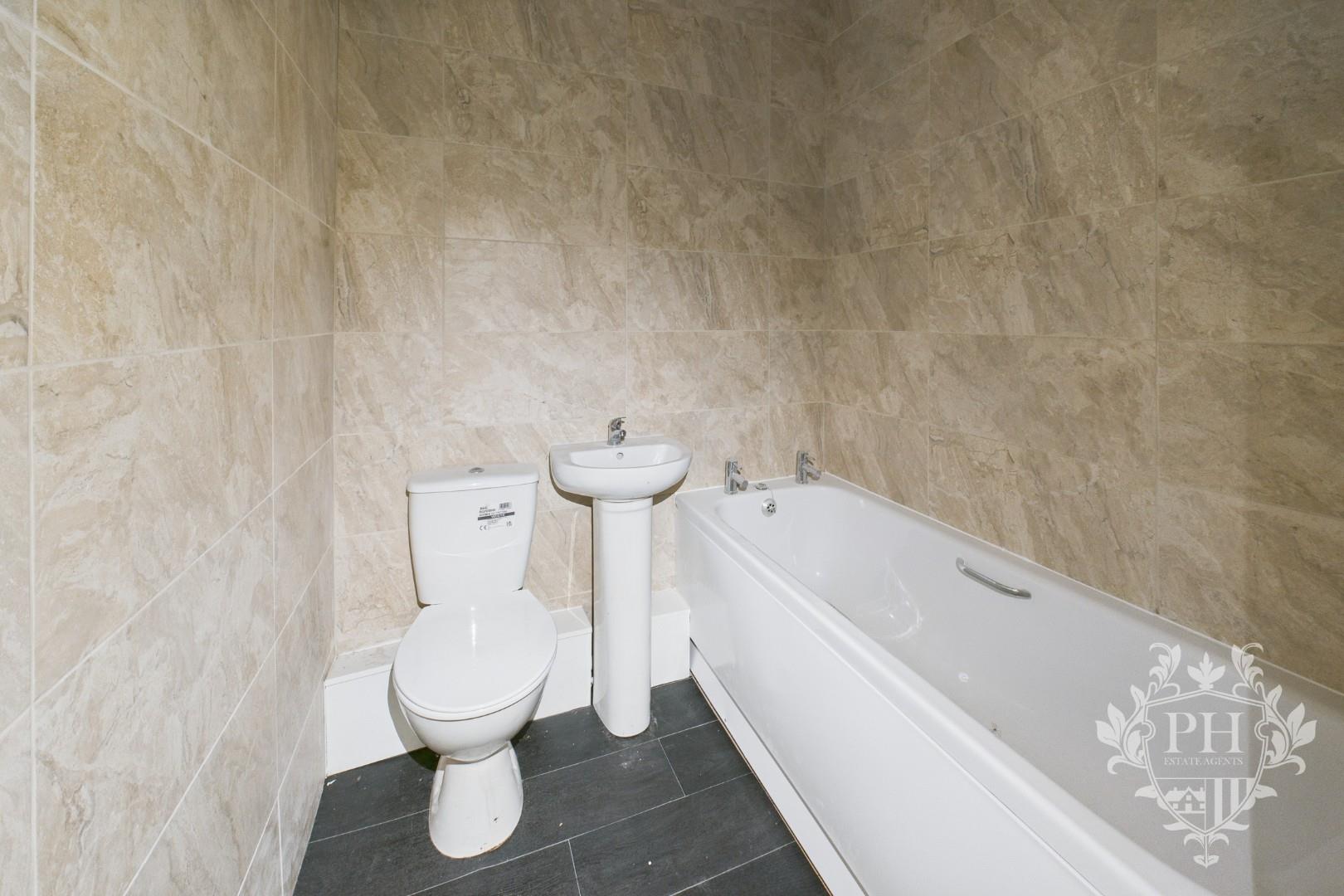 The family bathroom features a modern three-piece suite comprising a panelled bath with shower attachments, a hand basin, and a low-level WC. The space is finished with contemporary tiled surrounds that add a clean, stylish touch, and a radiator provides warmth and comfort.