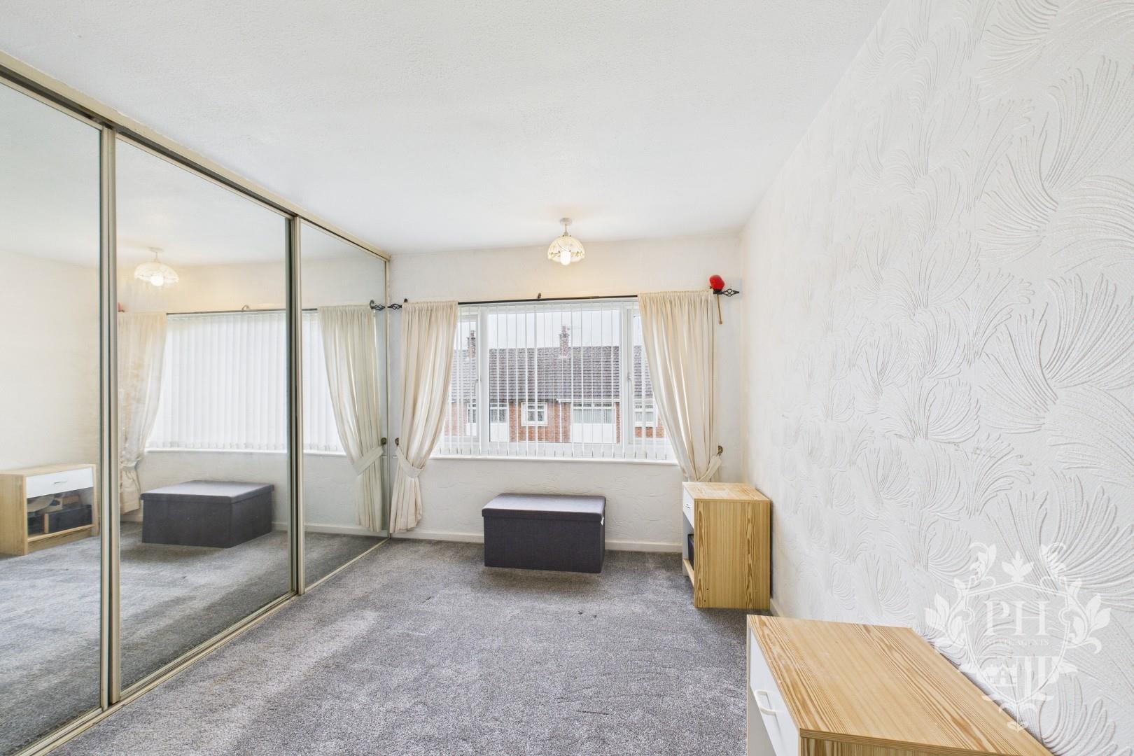 The first bedroom is positioned at the front of the house, catching plenty of natural light through its large UPVC double glazed window. There’s ample room for a double bed, along with extra storage pieces if you need them. Built-in sliding wardrobes stretch across one wall, offering a sleek and practical solution for keeping clothes and belongings organized. Soft carpet underfoot adds warmth and comfort, while a radiator keeps the space cozy year-round.