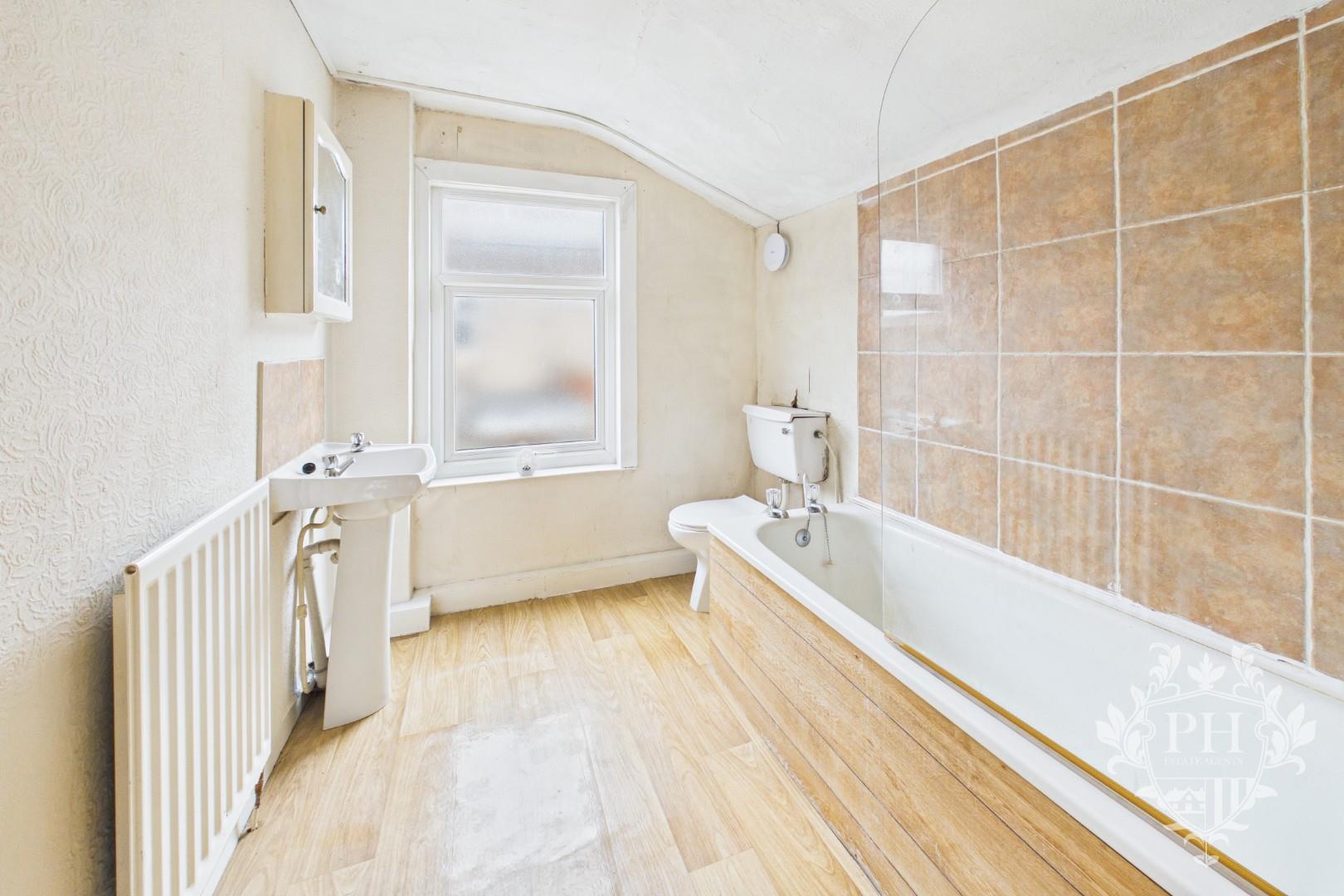 The family bathroom offers generous space, featuring a classic three-piece suite with a deep paneled bathtub perfect for unwinding, a hand basin, and a discreet low-level toilet. Natural light filters softly through a frosted UPVC double-glazed window, ensuring privacy while brightening the room, and a well-placed radiator keeps the entire space warm and comfortable.