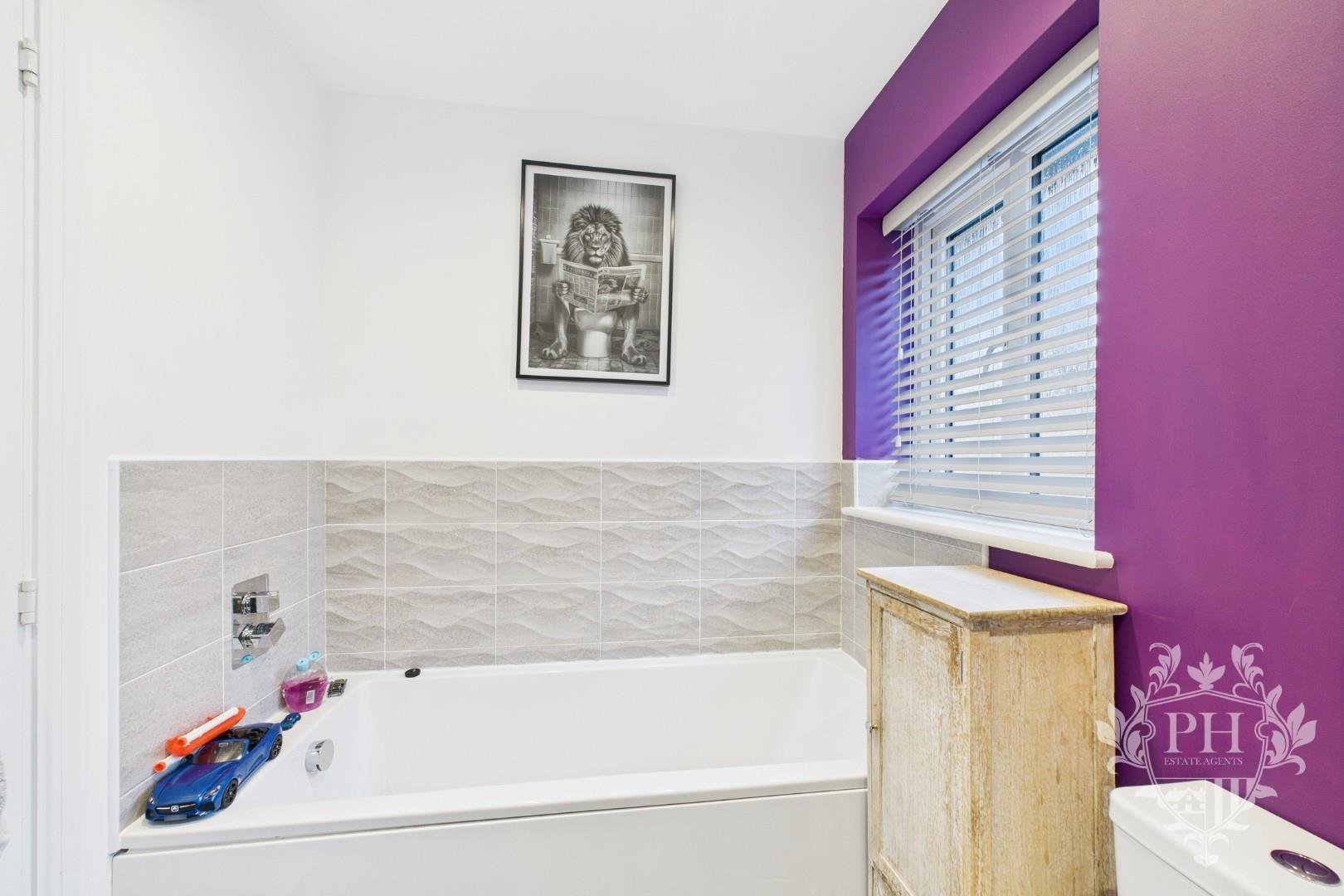 The family bathroom features a thoughtfully designed four-piece suite, offering both functionality and comfort. There’s a spacious step-in shower cubicle fitted with a thermostatic shower, enclosed by sleek glass panels. A paneled bathtub provides a spot to unwind, while the hand basin and low-level w.c. complete the essentials. Natural light filters in through a frosted UPVC double-glazed window, ensuring privacy without sacrificing brightness. The room is kept cozy by a modern radiator, and the contemporary flooring ties everything together with a clean, polished finish.