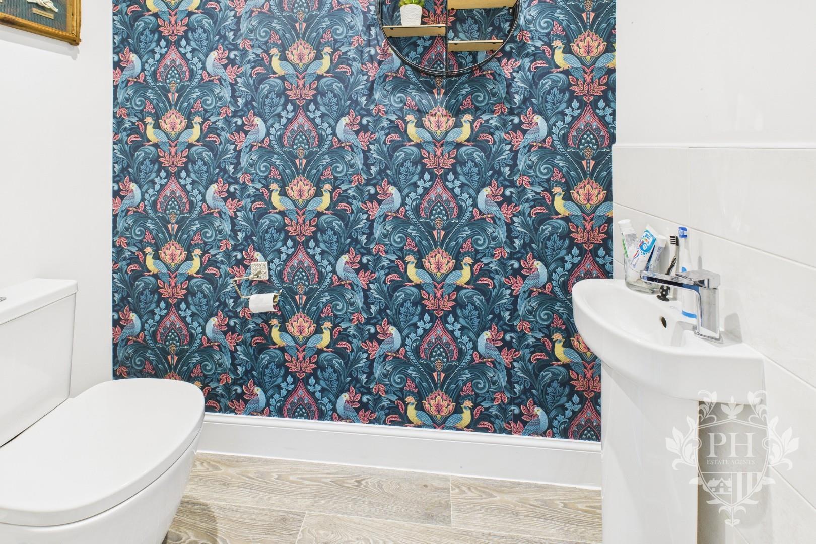 The ground floor w.c features a contemporary two-piece suite, consisting of a sleek hand basin and a low-level toilet. Above the basin, a crisp tile splashback adds a practical and stylish touch, while a radiator keeps the space warm and comfortable. The room is finished with modern flooring that complements the overall design, creating a clean and inviting atmosphere.