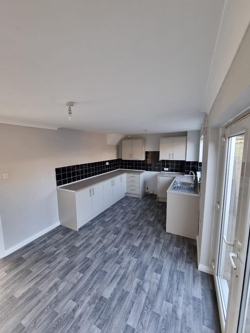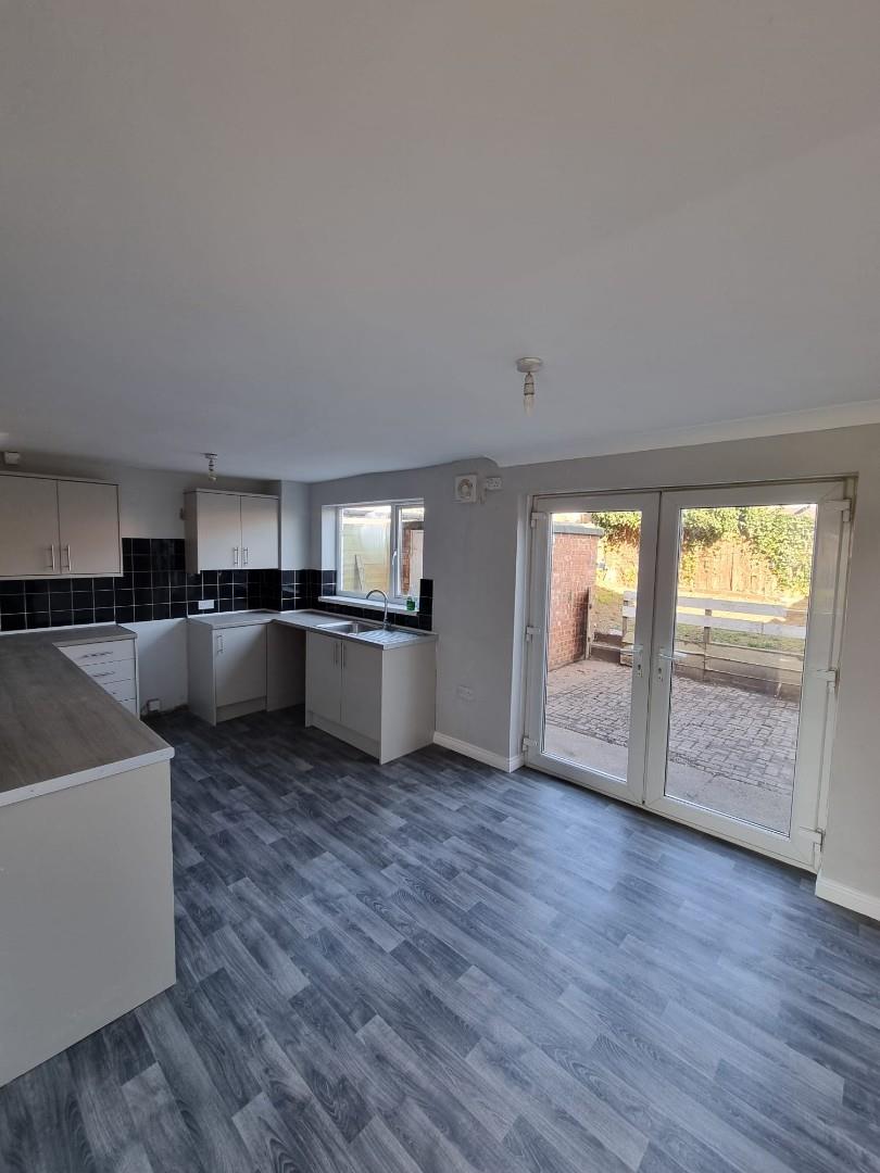 The kitchen and dining area is fitted with a generous selection of light-colored wall cabinets, base units, and spacious drawers, all set off by sleek, dark worktops that add a touch of modern contrast. There is ample space for free-standing appliances, allowing you to customize the setup to suit your needs. Toward the rear of the kitchen, there’s plenty of room for a dining table—ideal for family meals or entertaining guests. Natural light pours in through a large UPVC double glazed window, while elegant French doors open to the outside, creating a bright and inviting atmosphere throughout the space.
