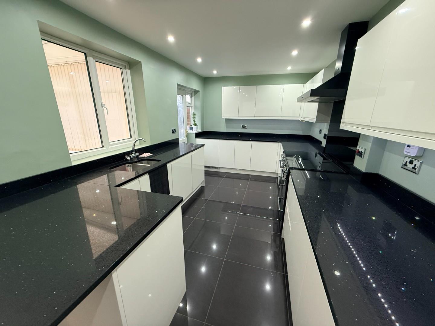 The kitchen features a sleek arrangement of white high-gloss wall, base, and drawer units, beautifully contrasted by dark worktops that add depth and character to the space. There is ample room for free-standing appliances, allowing for a flexible layout to suit your needs. A UPVC double-glazed door provides direct access to the rear garden, while elegant French doors open into the conservatory, filling the room with light and creating a seamless flow between the indoor and outdoor living areas.