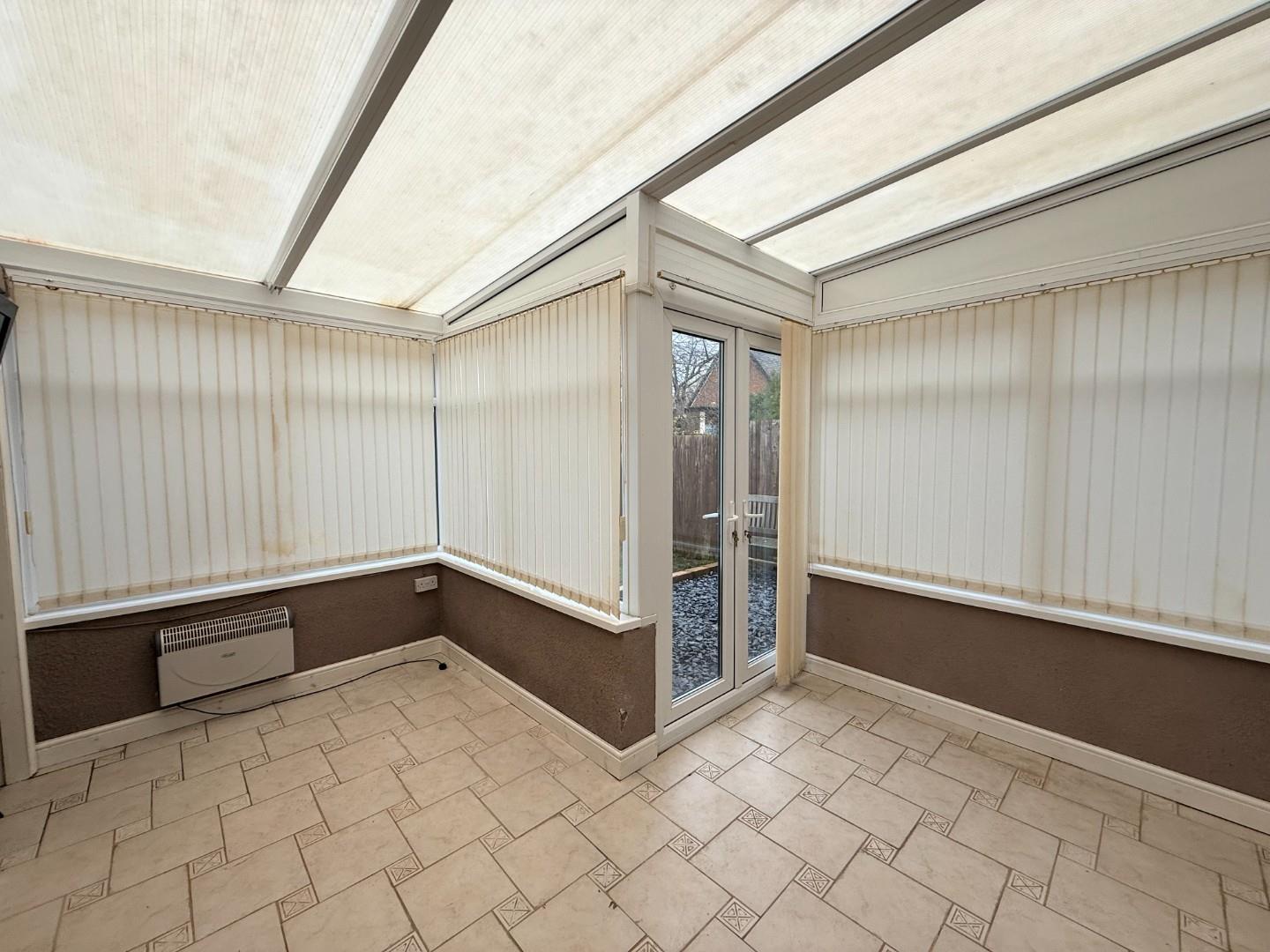 The conservatory, accessed directly from the kitchen, offers a bright and inviting additional living space, comfortably accommodating a two- or three-piece furniture set. Surrounded by UPVC double-glazed windows, it enjoys generous natural light throughout the day, while French doors open out to the garden, creating a smooth transition between indoor and outdoor areas. Finished with sleek floor tiles for easy maintenance, this versatile room also provides convenient internal access to the garage.