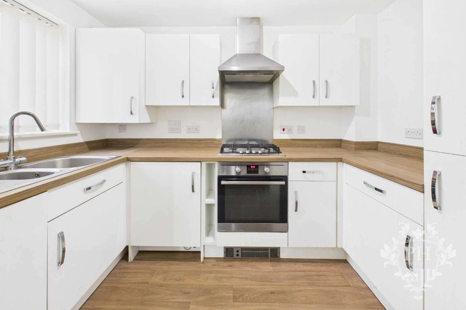 The modern kitchen is fitted with an array of white high-gloss wall, base, and drawer units, complemented by contrasting wood-effect worktops that add warmth and style. Integrated appliances include an oven with a gas hob above and a fridge freezer, creating a sleek and streamlined finish. Further benefits include a UPVC double-glazed window providing natural light, a fitted radiator, and contemporary flooring, making the kitchen both practical and visually appealing.