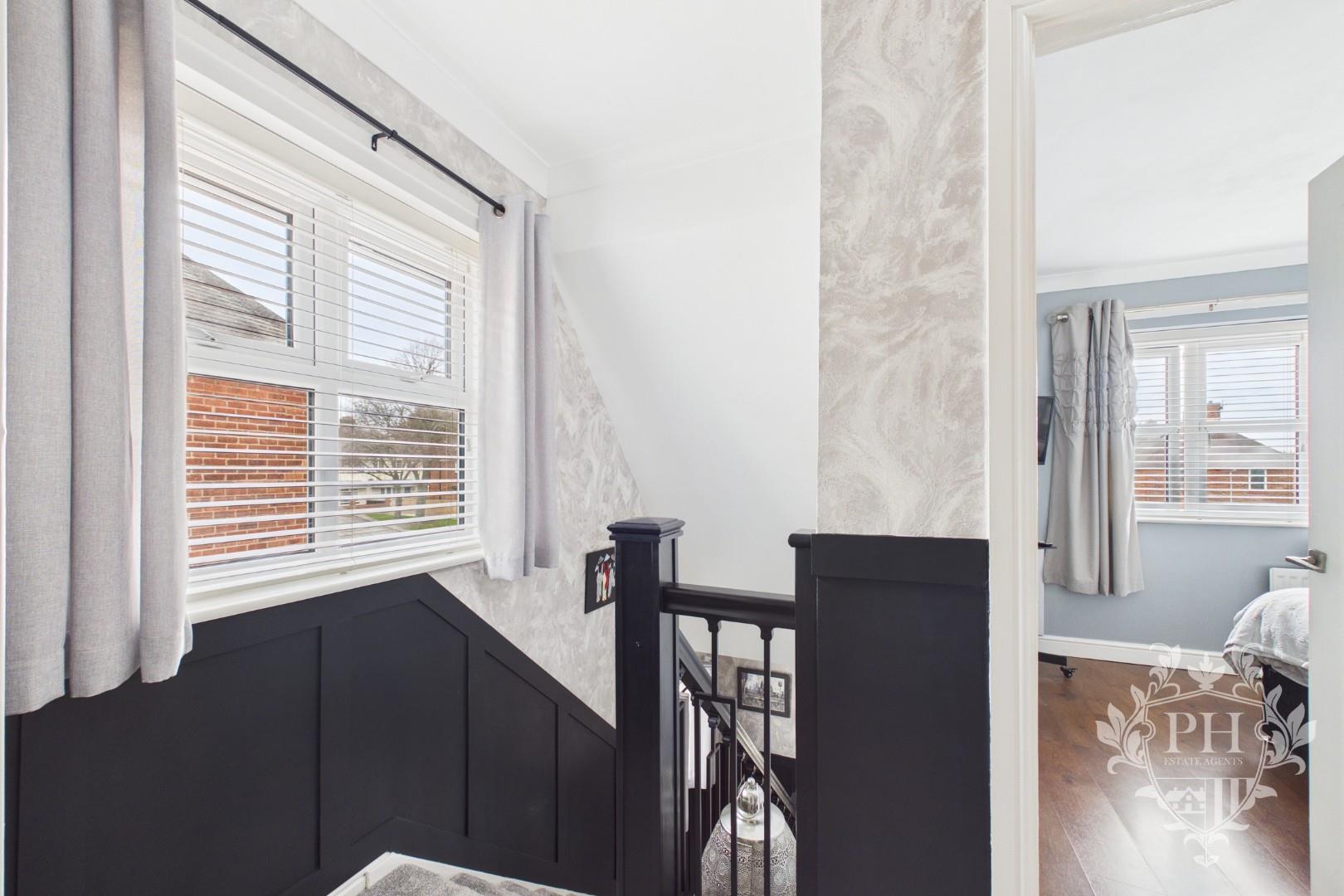 From the landing, you’ll find doors leading to two generously sized bedrooms and a well-appointed family bathroom. Sunlight pours in through a large UPVC double glazed window, brightening the space and highlighting the soft, plush carpeting underfoot. A sleek, black modern banister lines the stairs, adding a stylish touch. There’s also convenient access to the loft, perfect for extra storage or potential expansion.