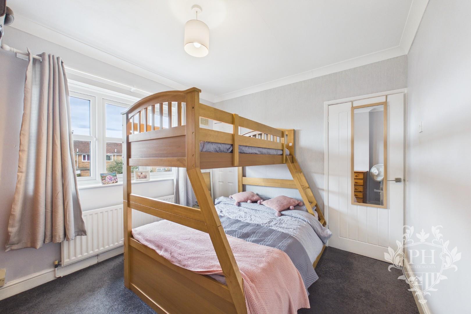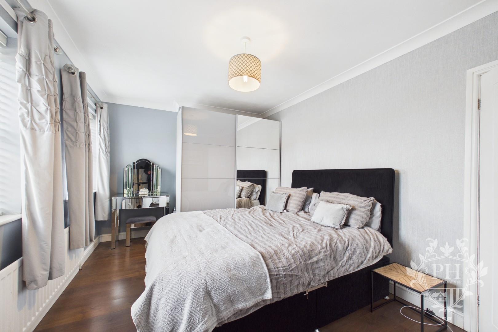 The first bedroom is impressively spacious and positioned at the front of the house, offering a welcoming atmosphere filled with natural light. It easily accommodates a double bed along with sizable wardrobes or storage units, without ever feeling cramped. Two large UPVC double glazed windows frame the room, providing both excellent insulation and views of the street below. The sleek laminate flooring adds a modern touch, while a built-in storage cupboard offers a convenient solution for keeping belongings neatly tucked away. A radiator ensures the room stays warm and comfortable throughout the year.