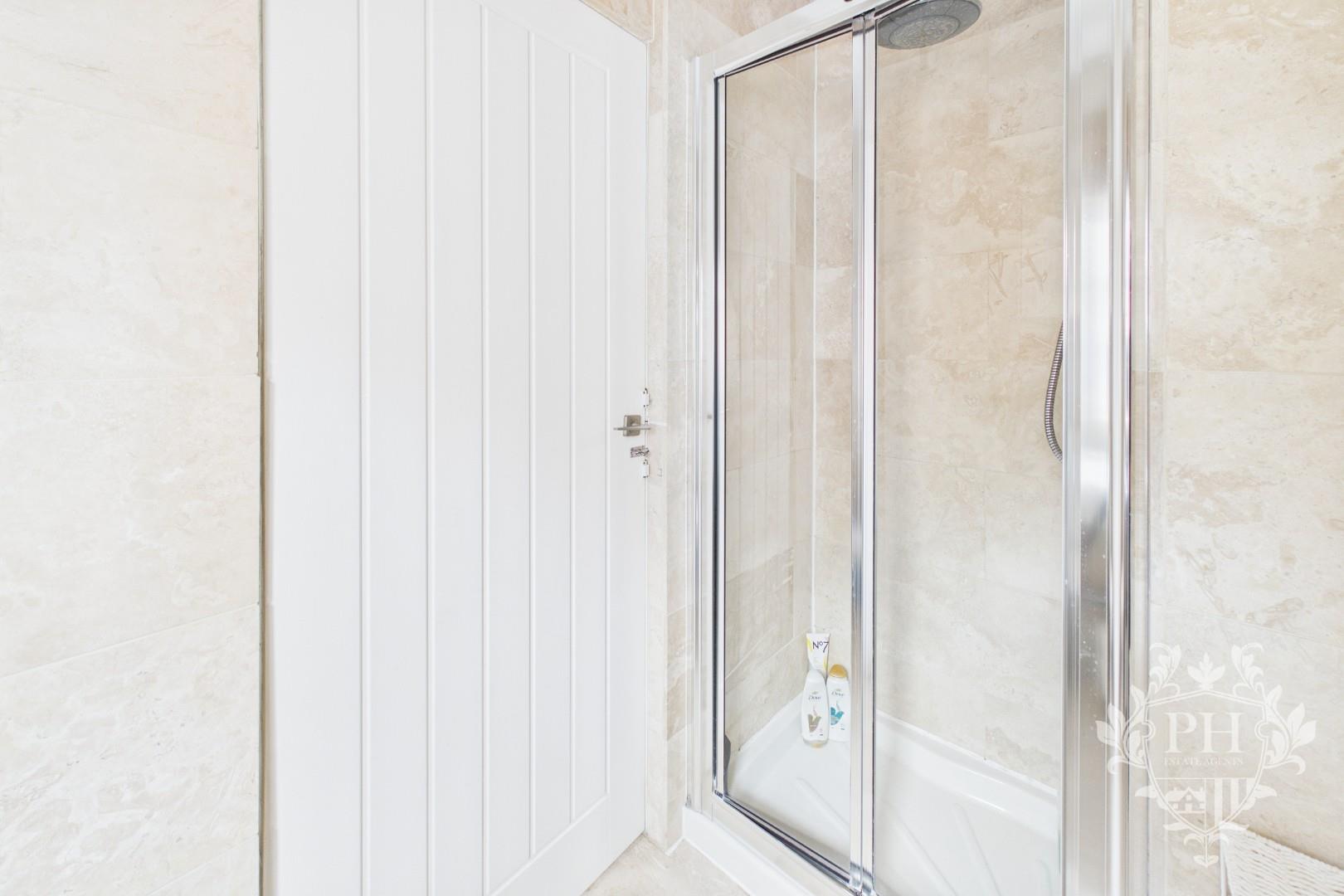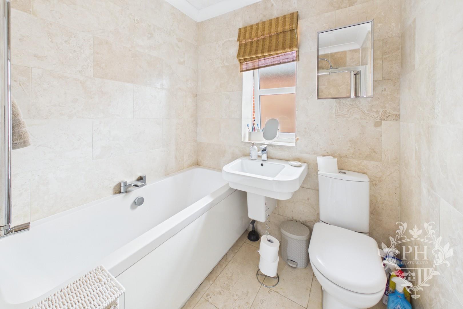 The family bathroom features a classic three-piece suite, thoughtfully arranged for comfort and functionality. At its center is a generously sized paneled bathtub, perfect for long, relaxing soaks. Beside it, a step-in shower cubicle with a sleek sliding glass door offers a convenient space for quick, refreshing showers. The modern hand basin sits beneath a frosted UPVC double-glazed window, which diffuses natural light while ensuring privacy. A low-level toilet completes the suite, and the room is finished with elegant tile surrounds and a warm radiator, making the space both inviting and practical.