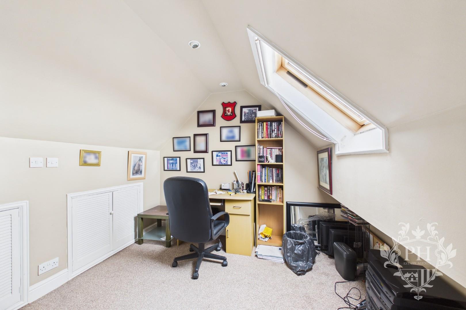 The loft has been thoughtfully converted into a bright, inviting office space. Natural light pours in through a skylight window, making it an ideal spot for focused work or creative projects. Cleverly designed eaves storage offers plenty of room to tuck away books, supplies, or seasonal items. Access is from the landing via a set of sturdy ladders, adding a touch of character and adventure to the space.
