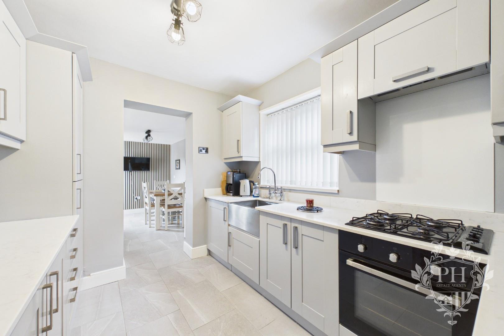 The kitchen features a sleek, modern design with a collection of light grey shaker-style cabinets, drawers, and wall units, each finished with polished chrome handles that catch the light. A stainless steel sink sits beneath a UPVC double-glazed window, allowing soft daylight to fill the room and offering a pleasant view to the side. The light-colored worktops provide ample space for meal prep and blend seamlessly with the contemporary look, while integrated appliances are tucked away for a clean, uncluttered feel. Underfoot, stylish modern floor tiles add both durability and visual interest. The kitchen opens directly into the dining area, making it easy to serve meals and entertain guests.