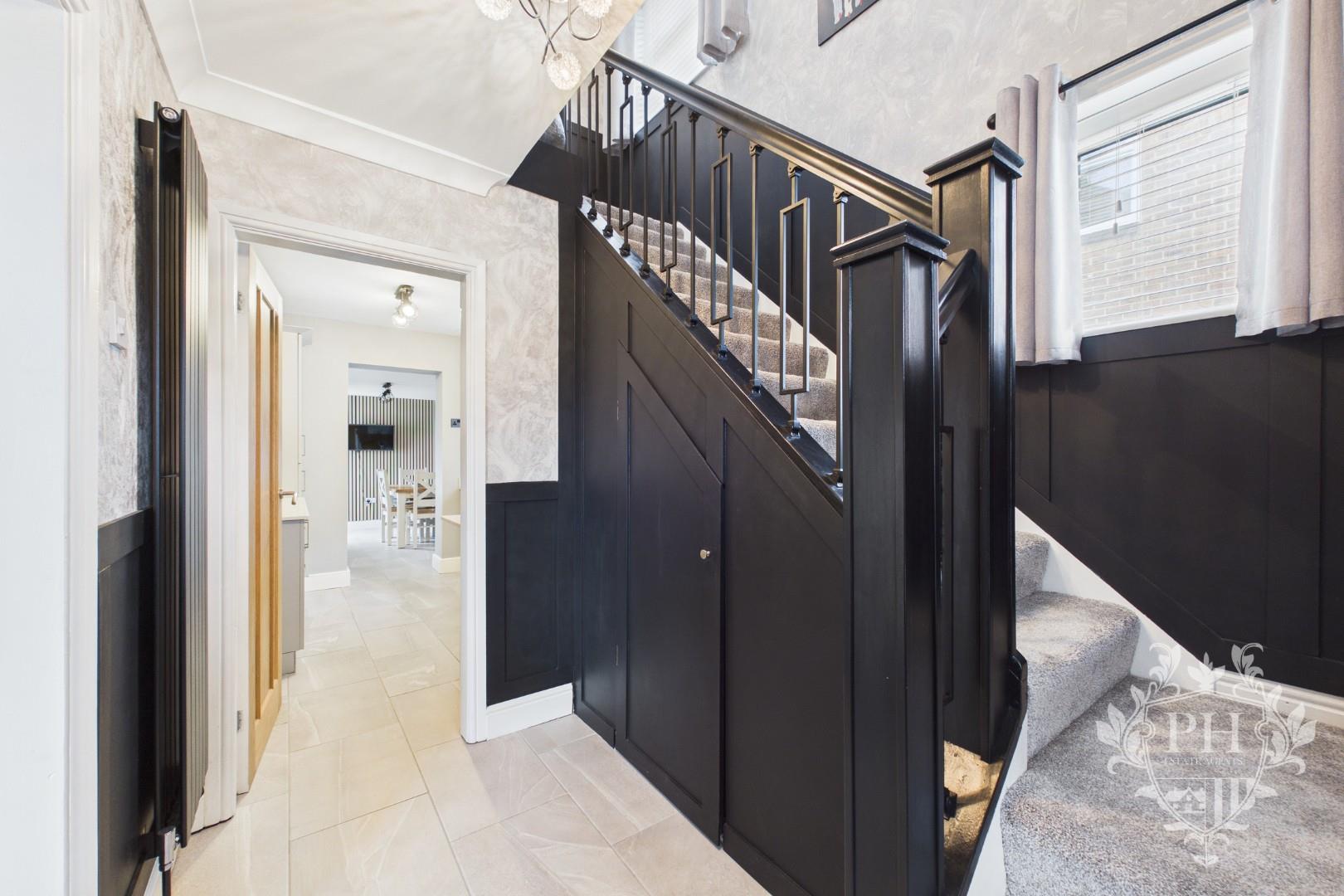 Step through the striking black composite front door, leaving the neat front garden behind and entering a bright, modern hallway. This welcoming space serves as the gateway to the expansive main reception room, the kitchen, and the staircase leading to the first floor. Natural light pours in from a UPVC double-glazed window set along the side, illuminating the hallway and highlighting the sleek, tiled flooring that continues seamlessly into the kitchen. Thoughtful touches include a spacious understair storage cupboard, perfect for tucking away everyday essentials, and a contemporary radiator that keeps the area warm and inviting.