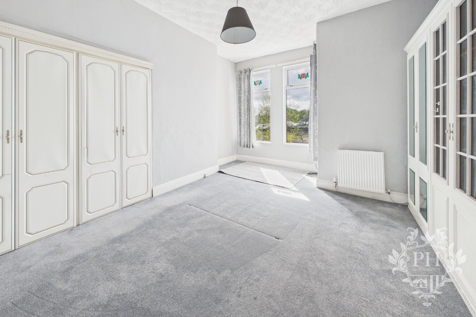The first bedroom is located at the front of the house, where sunlight pours in through two large windows, creating a bright and welcoming atmosphere. The space is generous enough to comfortably fit a double bed, and features built-in wardrobes that provide ample storage without sacrificing floor space. A radiator keeps the room cozy year-round.