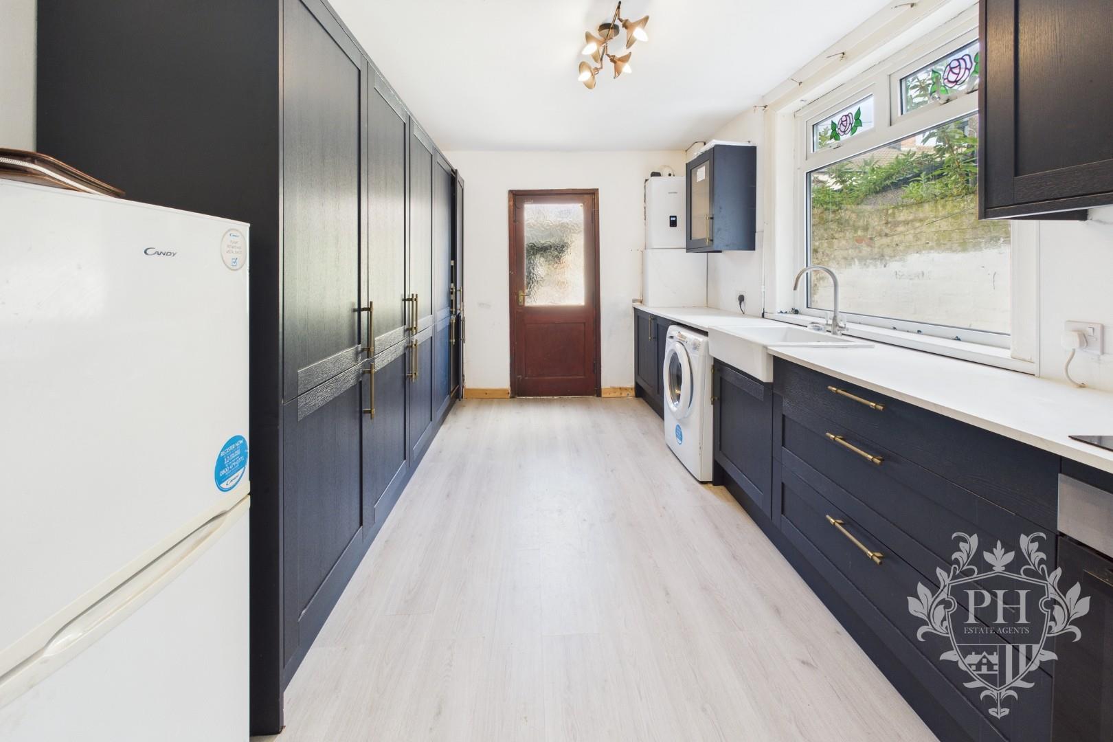 Tucked away at the back of the house, the kitchen features a striking collection of navy cabinets—wall-mounted, base, and deep drawers—that offer plenty of storage and a bold pop of color. The light countertops create a crisp contrast against the rich cabinetry, while a built-in oven sits neatly below a sleek electric hob, giving the space a modern, functional feel. There’s ample room for your own free-standing appliances, whether it's a dishwasher or a roomy fridge. Natural light pours in through a window overlooking the rear yard, and a door beside it opens directly outside, making it easy to step out with your morning coffee or bring in groceries. A radiator keeps the room cozy year-round.