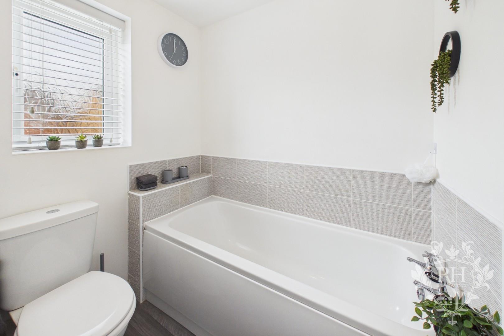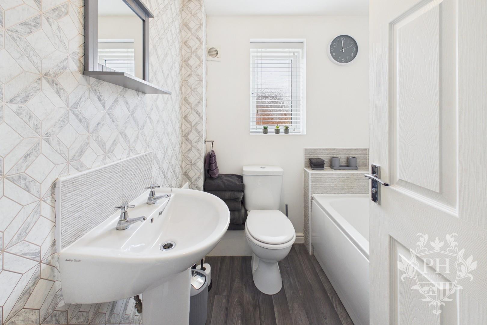 The family bathroom features a sleek, contemporary three-piece suite, complete with a deep paneled bathtub perfect for relaxing soaks, a stylish hand basin, and a low level toilet designed for comfort and efficiency. Natural light filters through a frosted UPVC double glazed window, ensuring privacy while brightening the space. A well-placed radiator keeps the room cozy, while modern flooring and tastefully partially tiled walls add a touch of elegance and make cleaning a breeze.
