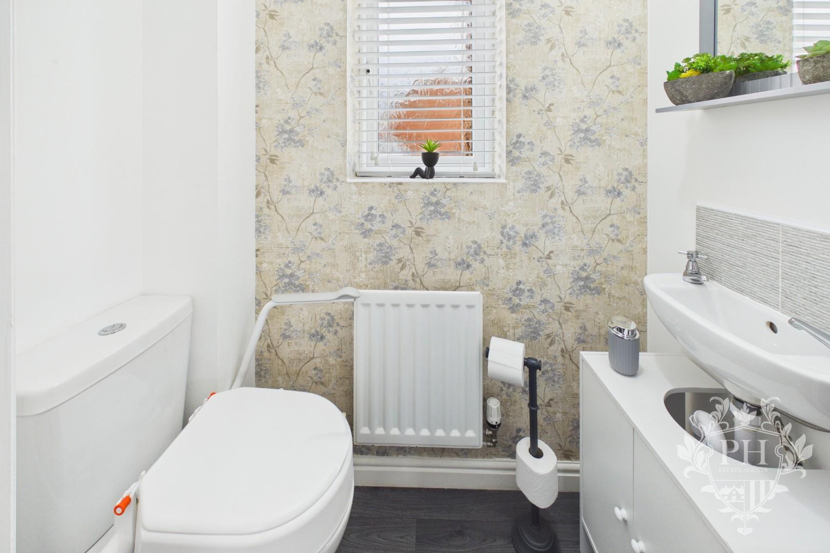 The ground floor w.c. features a stylish two-piece suite, including a sleek hand basin and a modern low-level toilet. Natural light filters in through a frosted UPVC double-glazed window, ensuring privacy while brightening the space. The contemporary radiator keeps the room comfortable, and the modern flooring ties the look together, giving the area a fresh, updated feel.