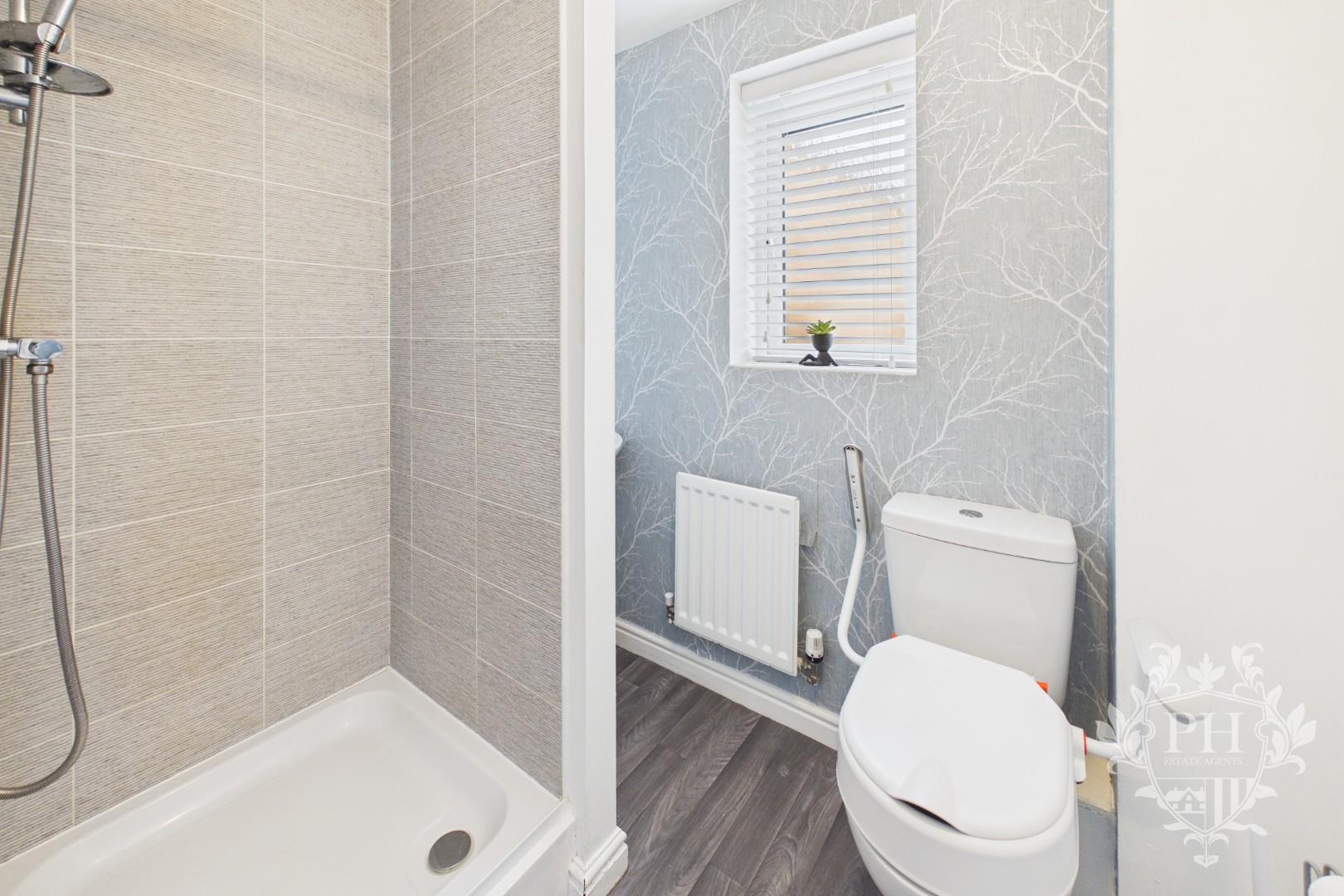 The en-suite features a modern three-piece suite, complete with a spacious step-in shower cubicle fitted with a thermostat-controlled shower for precise temperature adjustment. A sleek hand basin and a contemporary low-level WC provide both functionality and style. Natural light filters in through a frosted UPVC double-glazed window, ensuring privacy while brightening the space, and a radiator keeps the room comfortably warm.