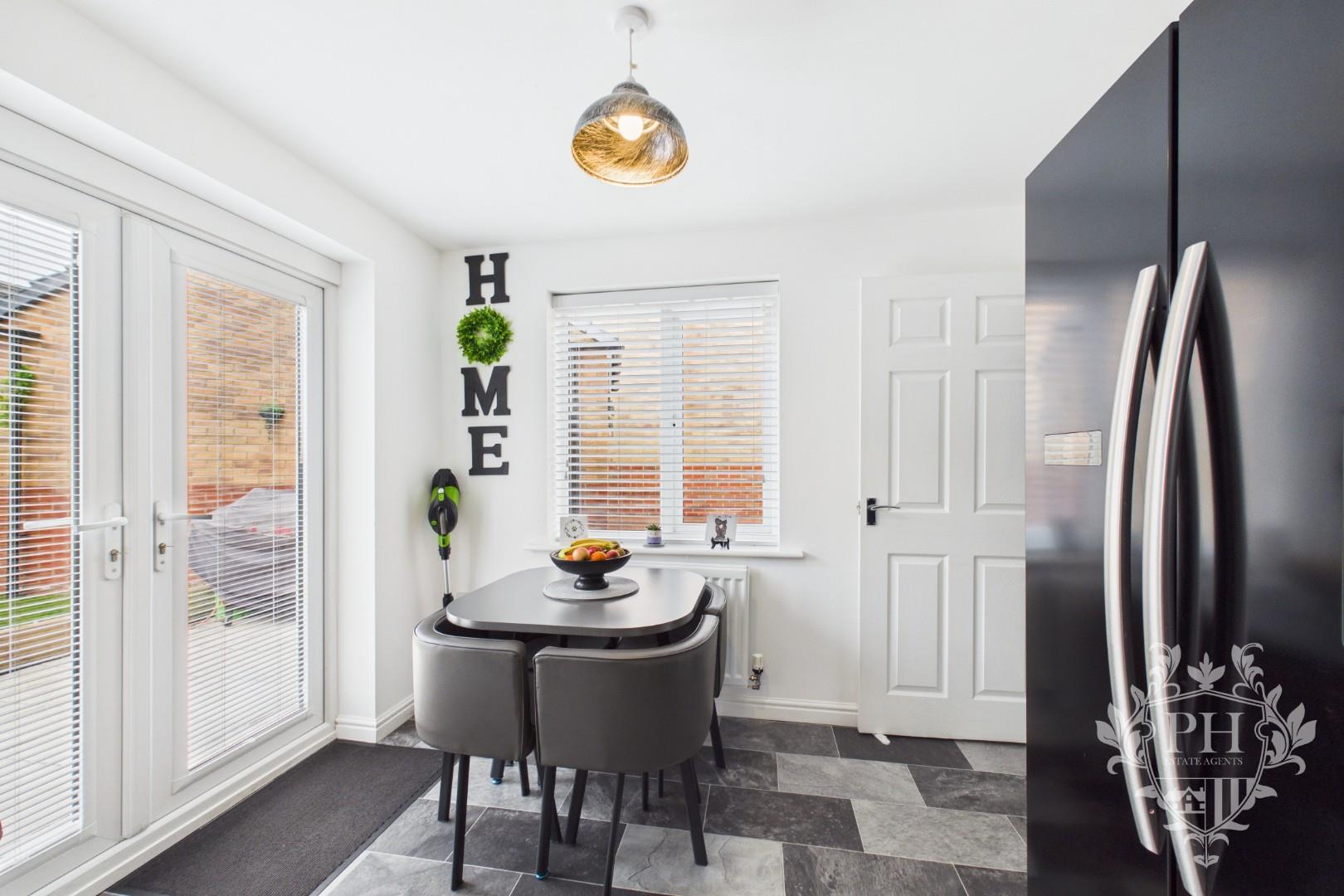 Adjacent to the kitchen, the dining area sits to the right side of the room. Here, there’s plenty of space for a generously sized dining table, perfect for family meals or entertaining guests. This area also enjoys natural light from another UPVC double-glazed window on the side wall. French doors open directly onto the patio, creating an easy flow between indoor and outdoor living and making alfresco dining just a step away.