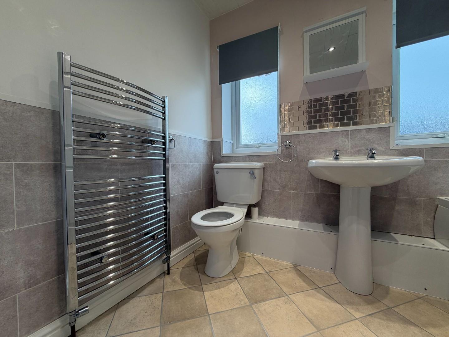 5' 8'' x 7' 8'' (1.73m x 2.34m) With panelled bath, shower and glass screen over, hand wash basin, WC, chrome ladder radiator, cladded ceiling with spotlights and two PVC double glazed windows.