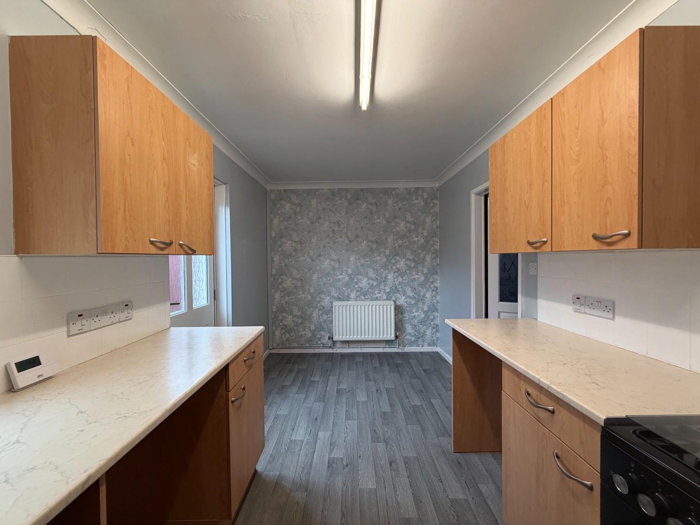 7' 11'' x 16' 10'' (2.41m x 5.13m) An open plan dining kitchen with a range of fitted kitchen units, roll top work surfaces, free standing gas oven, inset sink and sink and drainer, space for various appliances, space for dining table and chairs, central heated radiator, under stairs storage cupboard, PVC double glazed window and multi-locking external door to the rear garden.