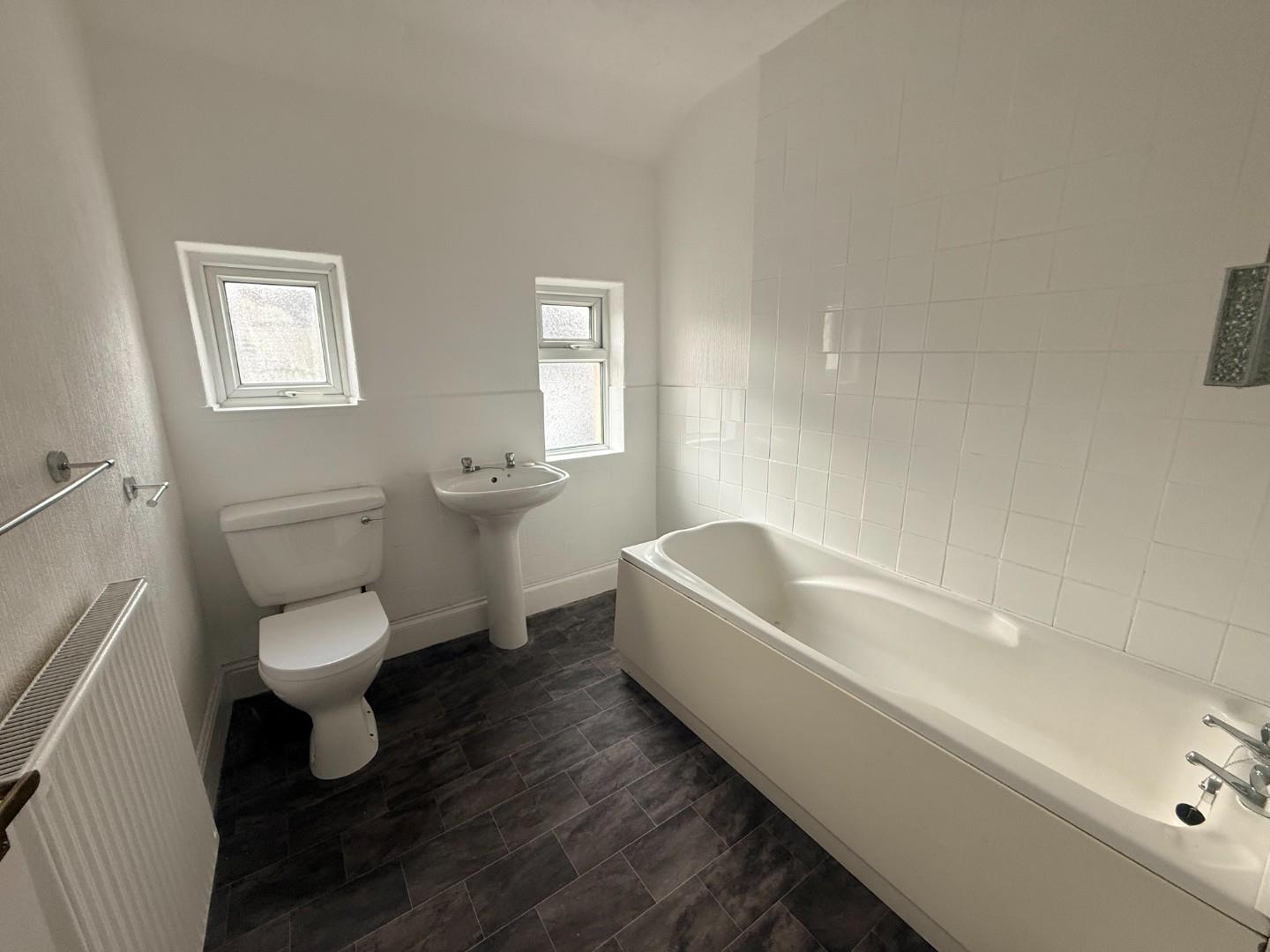 The family bathroom features a classic three-piece suite, consisting of a paneled bathtub with shower attachments, a spacious hand basin, and a low-level toilet. Two UPVC double-glazed windows fill the room with natural light while providing excellent insulation and privacy. The space is warmed by a well-placed radiator, and the partially tiled walls add a clean, contemporary touch to the overall design.