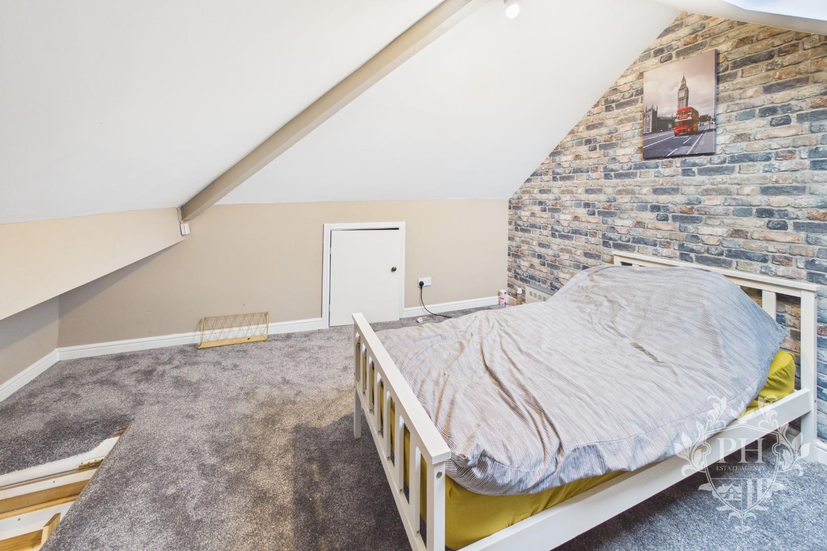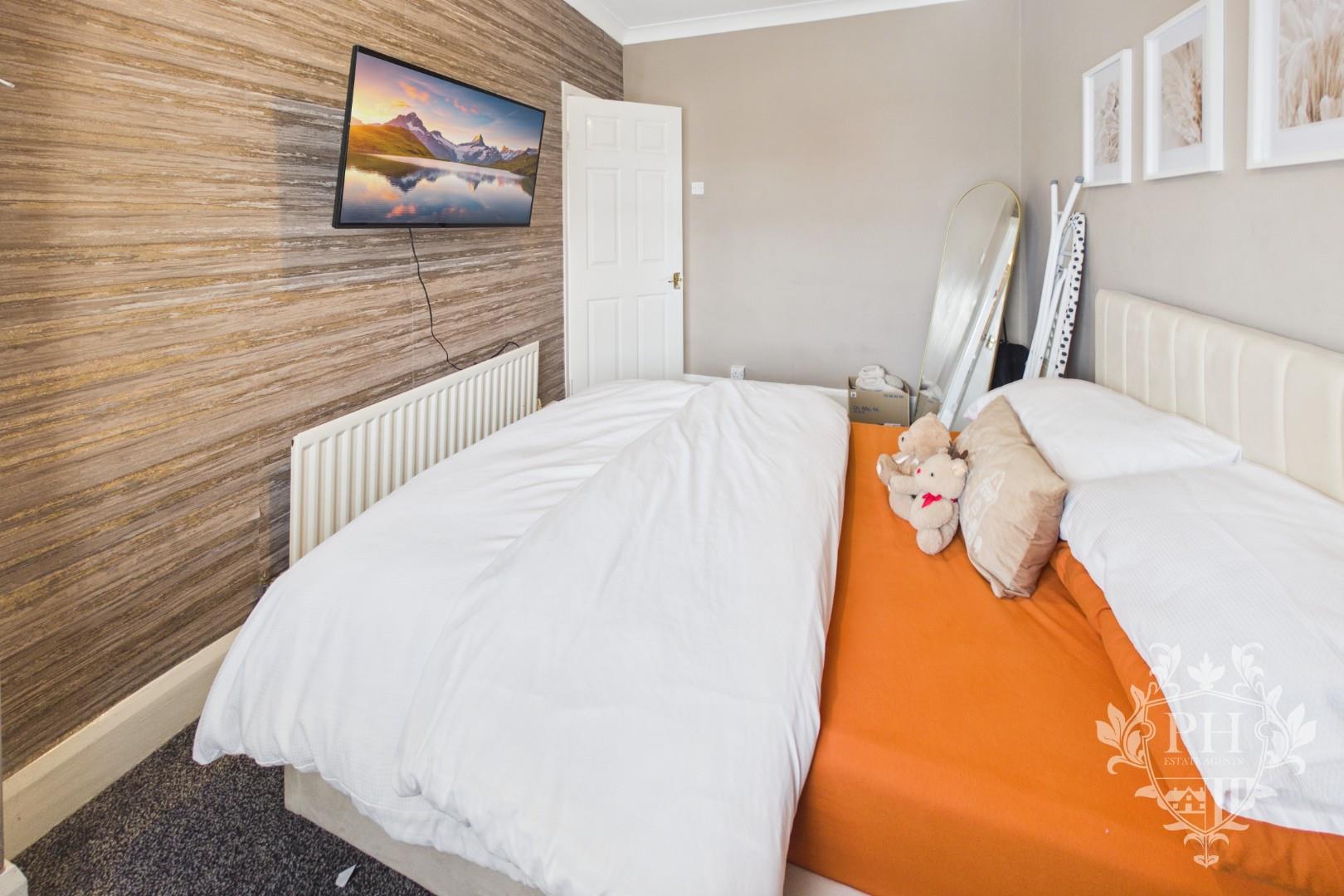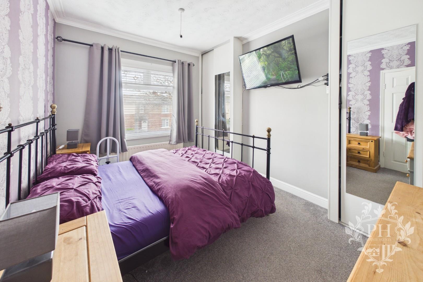 Tucked away at the back of the property, the second bedroom offers a peaceful retreat, easily fitting a double bed with room to spare for extra storage. A large window lets in plenty of natural light, while the soft grey carpet underfoot and a modern radiator make the space feel cozy and inviting.