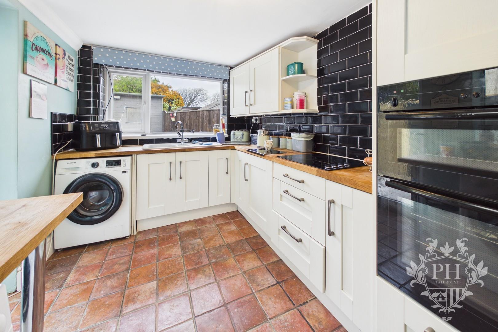 Tucked away at the back of the house, the kitchen is a bright, inviting space designed with both style and practicality in mind. Cream-colored cabinets line the walls, offering plenty of storage in the form of wall units, deep drawers, and sturdy base cupboards. The wood-effect countertops bring a touch of warmth and contrast beautifully with the high-gloss, brick-patterned splashback tiles that catch the light and add a modern flair. At the heart of the kitchen sits a sleek, built-in double electric oven paired with a smooth ceramic hob, ready for everything from weekday dinners to weekend baking sprees. There’s ample room for your favorite free-standing appliances, so everything you need is right at hand. A breakfast bar creates the perfect spot for a quick morning coffee or casual meals, while two generous windows fill the space with natural light. A door at the far end opens directly onto the rear garden, making it easy to step outside with a tray of drinks or enjoy fresh air while you cook.