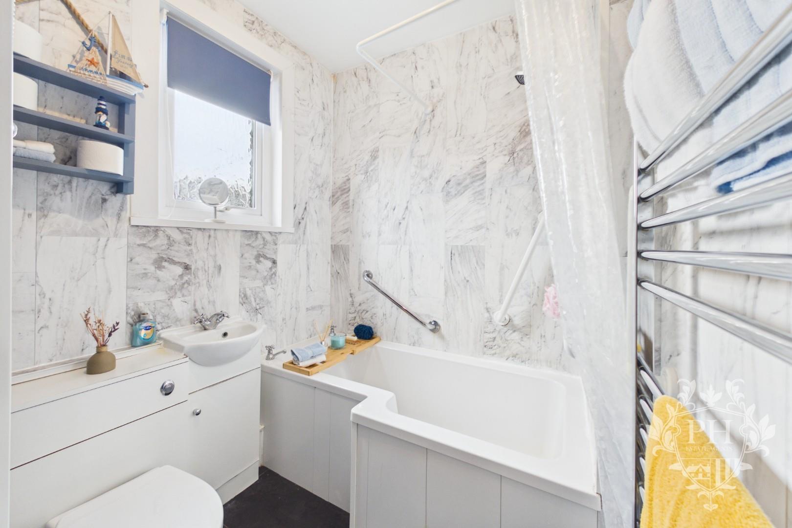 The family bathroom features a stylish three-piece suite, including an L-shaped paneled bathtub fitted with an overhead shower. A sleek hand basin is seamlessly integrated with a modern toilet, both set within a practical storage unit that keeps essentials neatly tucked away. Natural light filters softly through a frosted window, while a radiator beneath provides warmth, all framed by contemporary wall cladding that adds a polished finishing touch to the space.