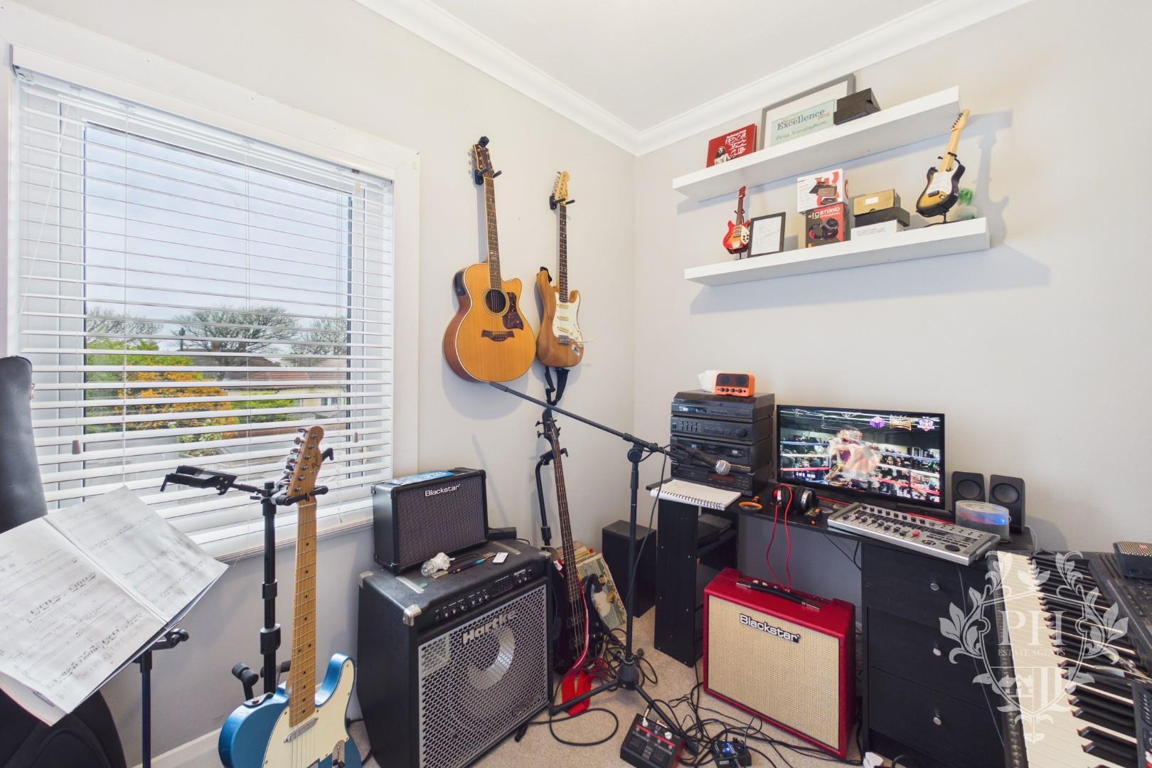 Tucked away at the back of the house, the third bedroom currently serves as a cozy home music studio. Sunlight spills in through a well-placed window, while a radiator keeps the space warm throughout the year. If returned to its original purpose, this room would comfortably accommodate a single bed and a few compact storage pieces—making it a versatile spot for guests, a child, or anyone seeking a quiet retreat.
