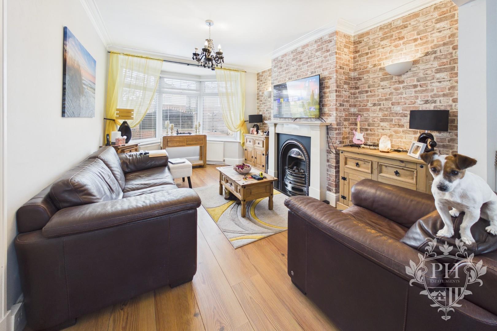 The reception area seamlessly flows into the dining space, creating an inviting open-plan layout. At the front of the room, the reception area offers ample space for a comfortable two-piece suite along with extra storage units. A large bay window floods the space with natural light and frames the view outside, while a stylish feature wall with an elegant fire surround and a cozy gas coal fire becomes the focal point of the room. A radiator ensures the space remains warm and welcoming, combining comfort with charm.