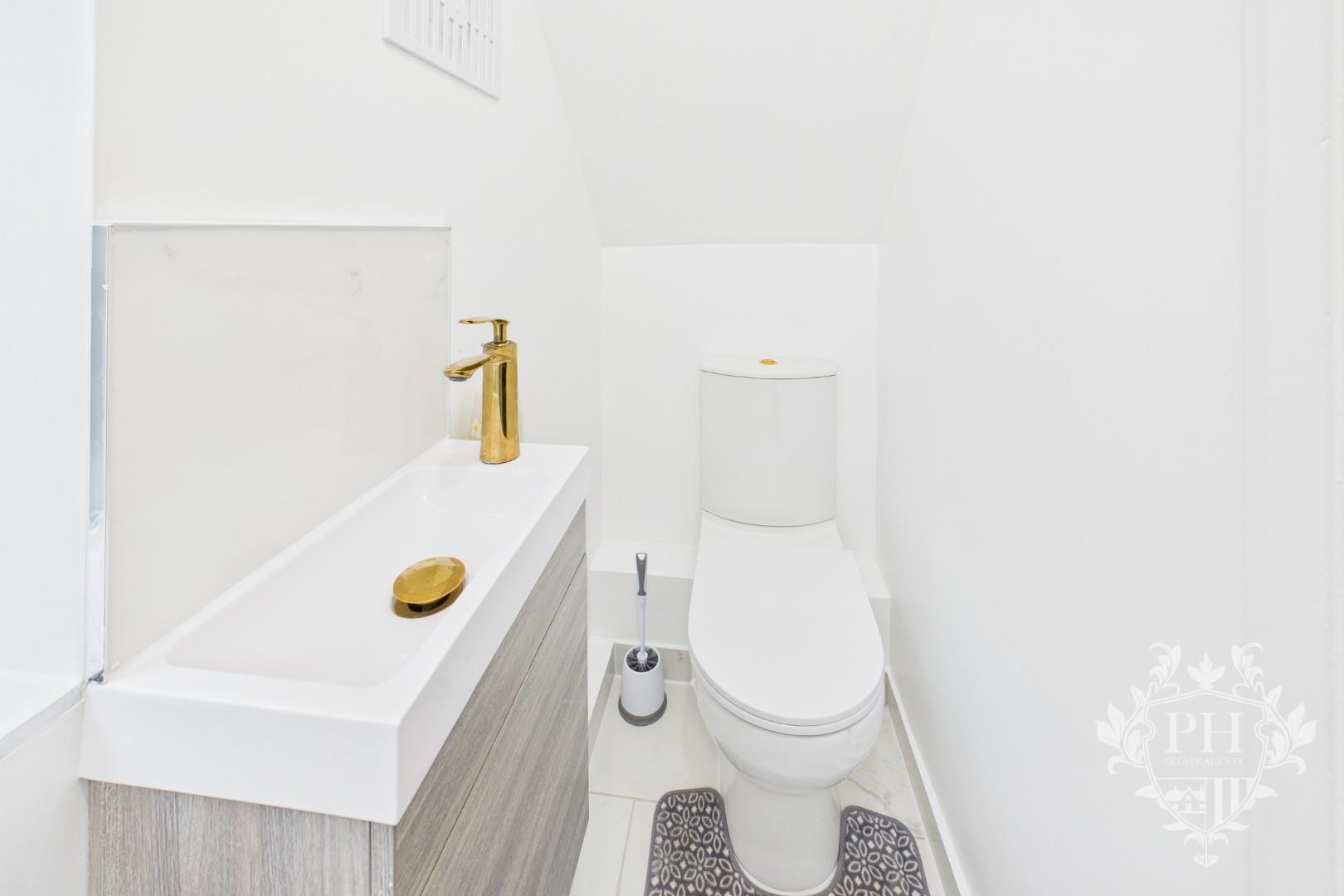 The ground floor w.c features a stylish, contemporary two-piece suite, with a sleek hand basin set atop a set of spacious drawers, perfect for organizing toiletries or essentials. The low-level w.c is designed for comfort and modern appeal. Crisp, freshly painted white walls brighten the room, reflecting the abundant natural light that gently filters through a frosted UPVC double glazed window, offering both privacy and warmth. Beneath your feet, polished white floor tiles create a clean, seamless look, complemented by a well-placed radiator to keep the space comfortably warm year-round.