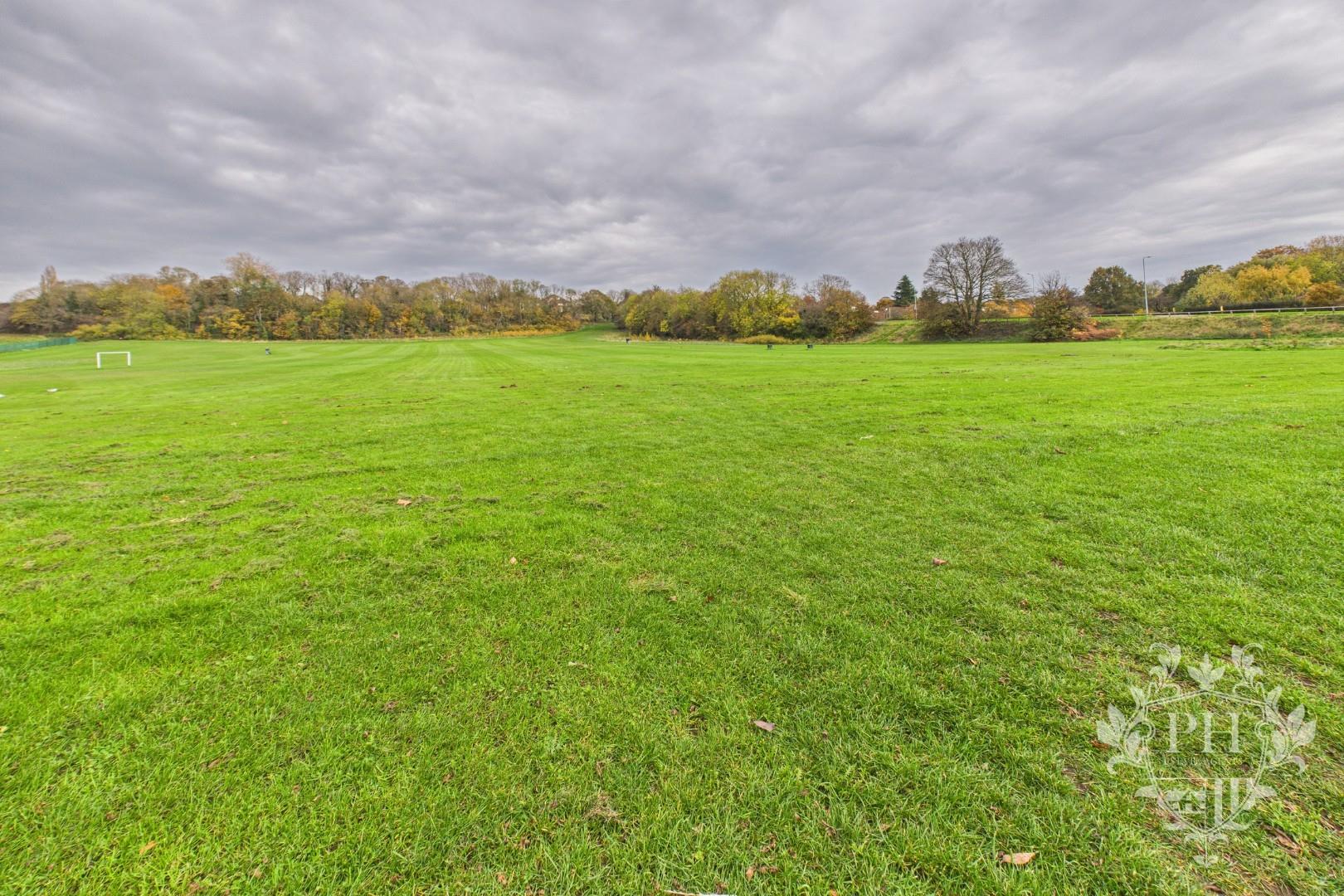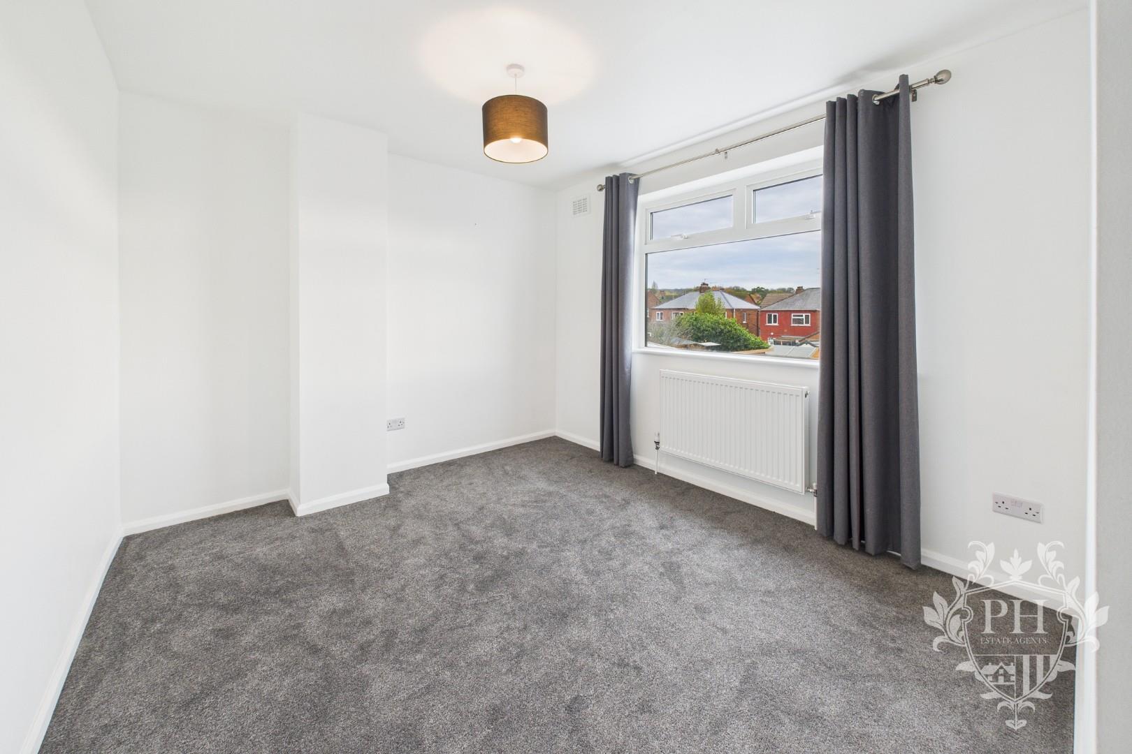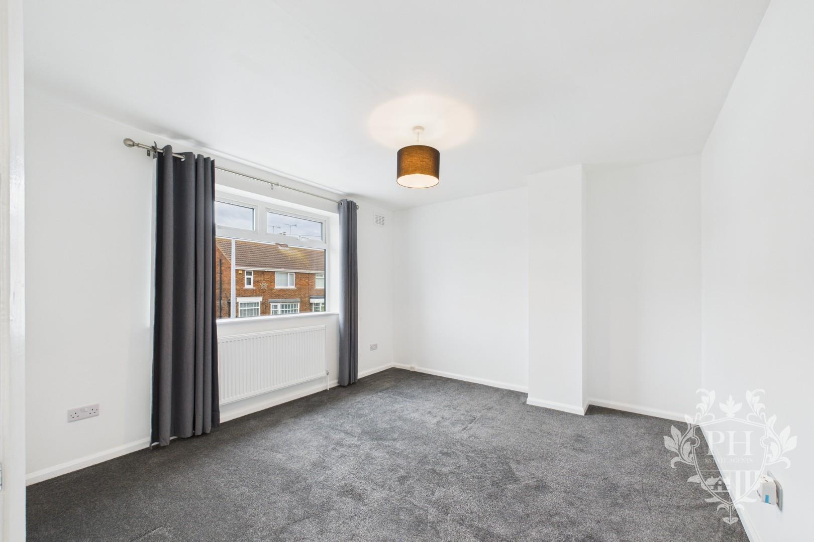 The second bedroom, positioned at the rear of the house, offers a welcoming sense of space that effortlessly fits a double bed along with larger storage furniture. Sunlight pours in through the windows, brightening the freshly painted white walls and reflecting softly off the plush grey carpet underfoot. A radiator, neatly tucked against one wall, keeps the room warm and cozy year-round. Twin alcoves on either side of the space add both character and practicality—ideal spots for wardrobes, additional shelving, or your own personal décor touches.