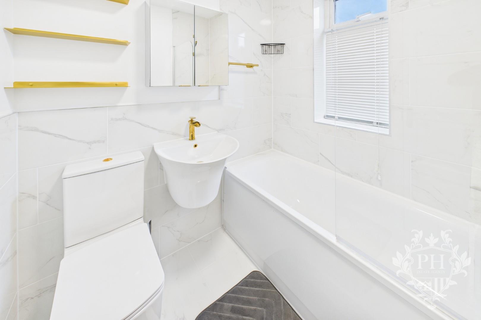 The family bathroom features a sleek, contemporary three-piece suite, complete with a deep paneled bath fitted with a thermostat-controlled shower and a clear glass screen to keep water in check. A stylish hand basin sits beneath the frosted UPVC double-glazed window, letting in soft, natural light while maintaining privacy. The low-level toilet is seamlessly integrated into the room’s design. Matching modern tiles cover both the walls and floor, creating a cohesive look, while elegant gold fixtures—taps, towel rails, and accessories—add a touch of warmth and luxury throughout the space.