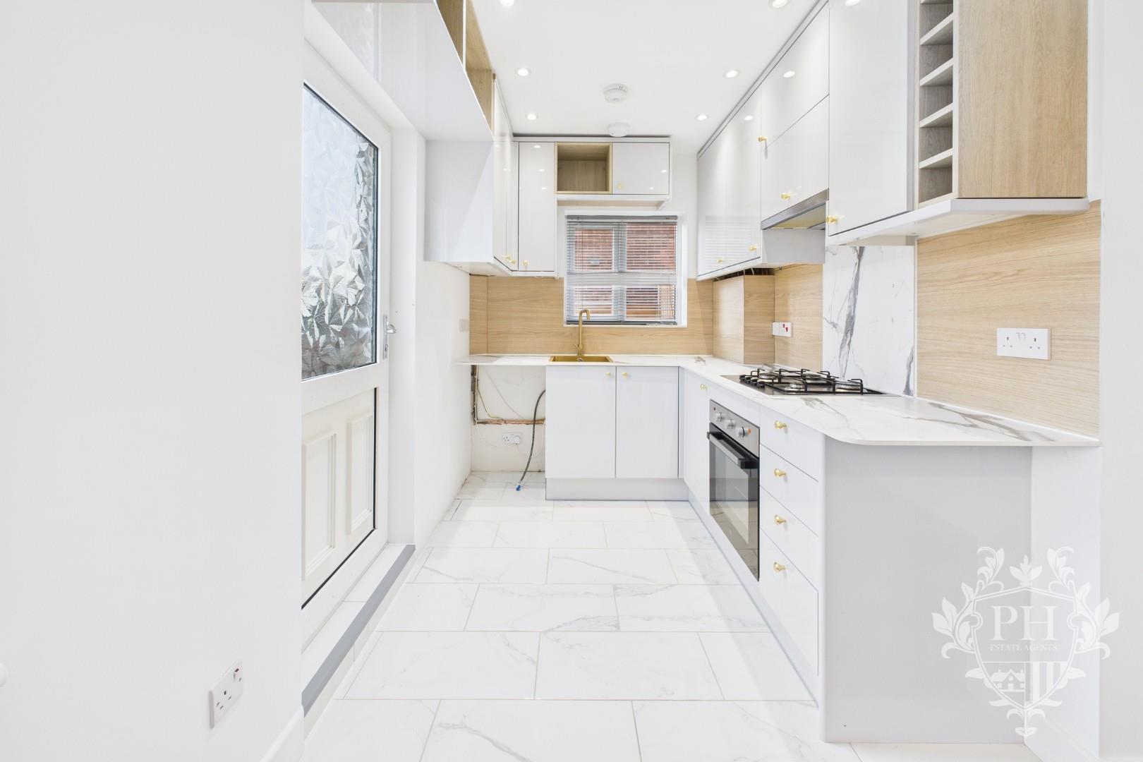 The kitchen features a sleek lineup of light grey, high-gloss wall cabinets, base units, and deep drawers, all fitted with striking gold accessories—elegant handles and a matching gold sink that add a hint of luxury to the space. Along one wall, there’s a built-in electric oven paired with a gas hob and an angled extractor fan above, making cooking both functional and stylish. Natural light pours in through a UPVC double glazed window, while a contemporary radiator keeps things cozy. A door at the far end opens directly onto the back garden, creating a seamless flow to the outdoors. There’s ample room for free-standing appliances, and the kitchen is finished with modern tile flooring that’s not just practical, but also adds a crisp, clean look underfoot.