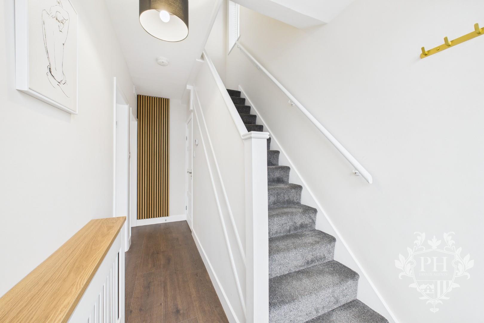 Step through the front garden and you'll find yourself in a welcoming, sunlit hallway with a contemporary feel. This inviting space serves as the central hub of the home, offering passage to the spacious reception room, an elegant dining area, a convenient downstairs w.c., and the staircase leading up to the first floor. The hallway is finished with sleek laminate flooring, a modern radiator to keep things cozy, and freshly painted walls that add to the airy, open atmosphere.