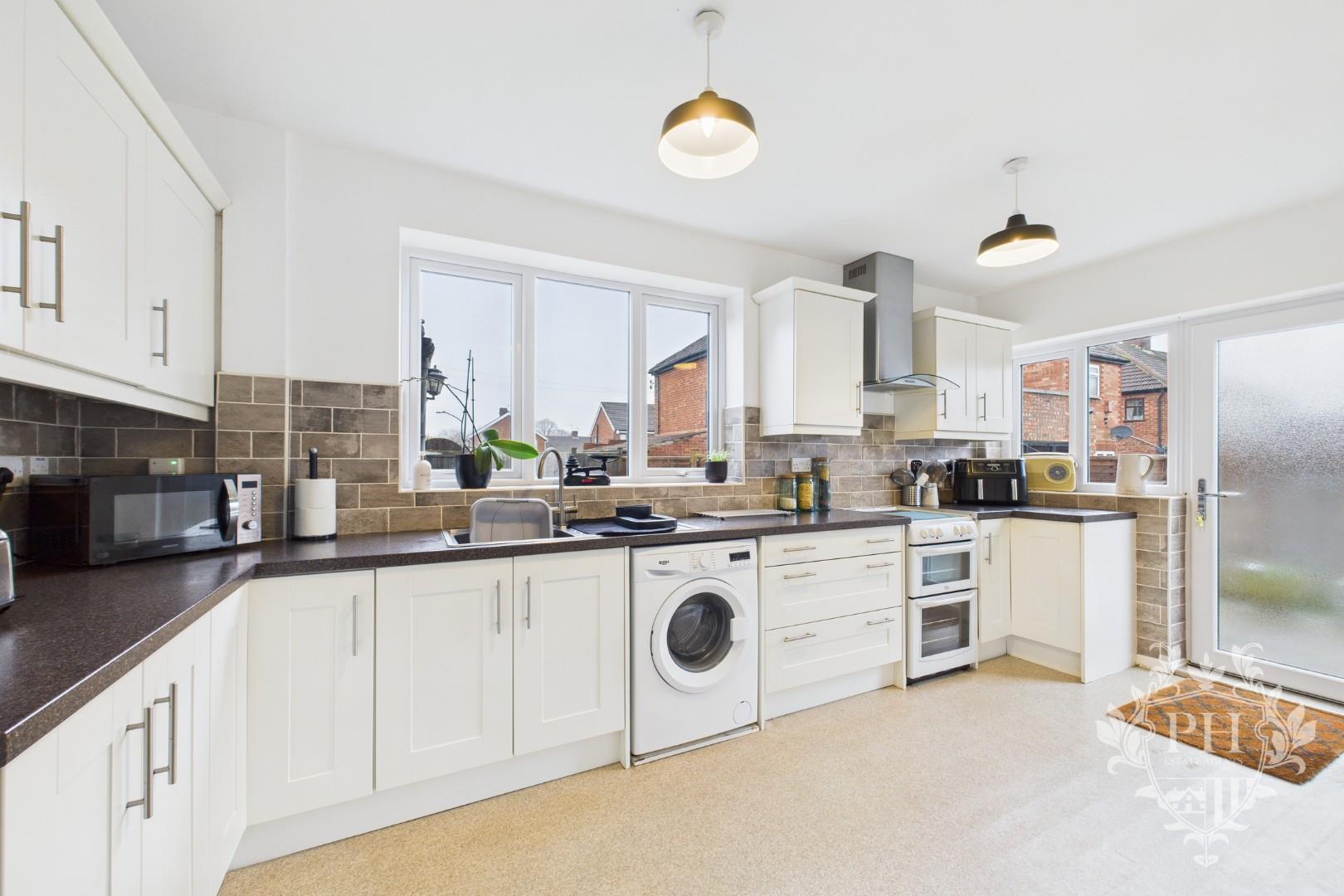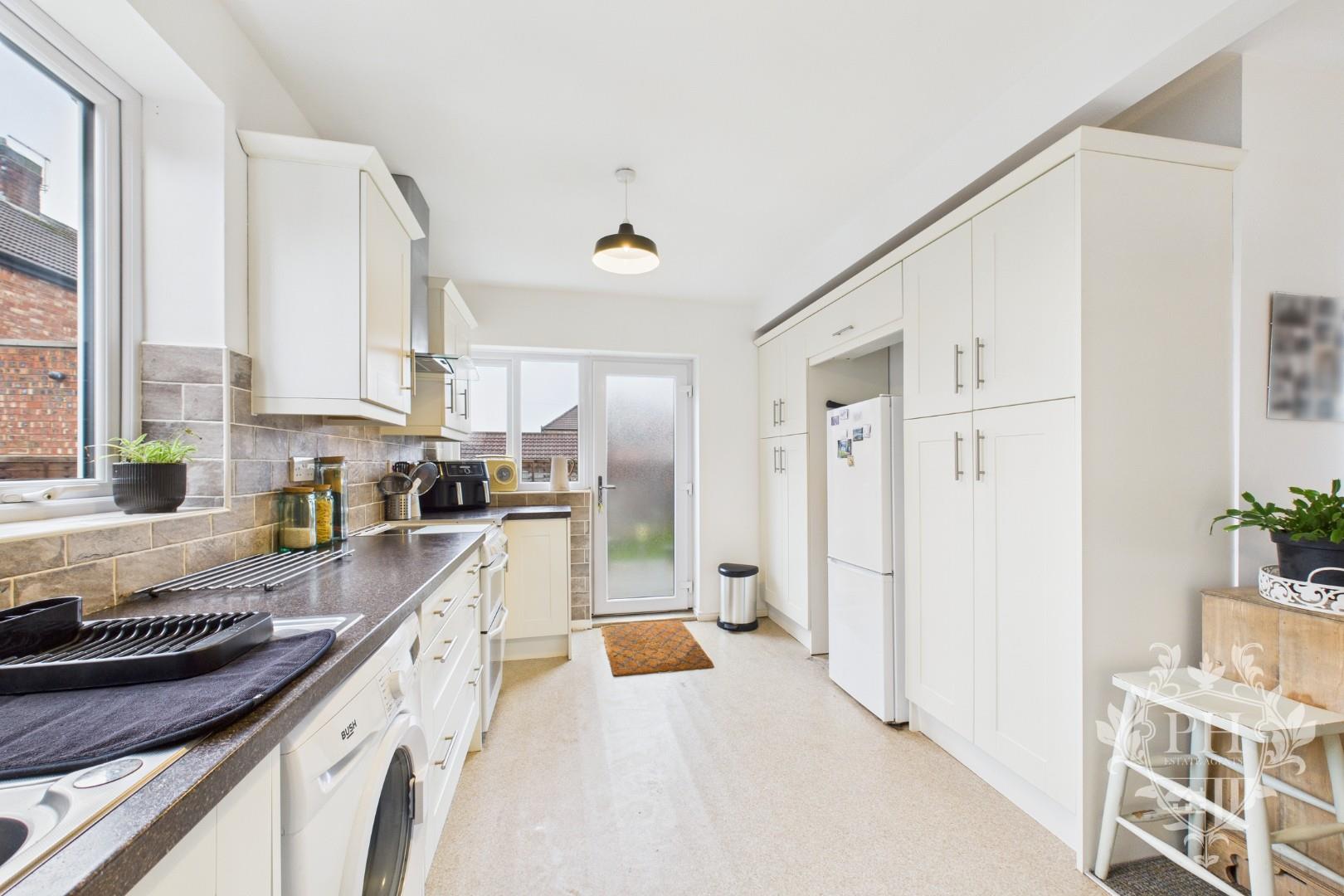 The kitchen features an extensive range of cream wall, base, and drawer units, complemented by contrasting dark worktops, and offers generous space for free-standing appliances. The room benefits from a UPVC double-glazed door providing access to the rear garden, along with a UPVC double-glazed window to the side aspect, allowing plenty of natural light.