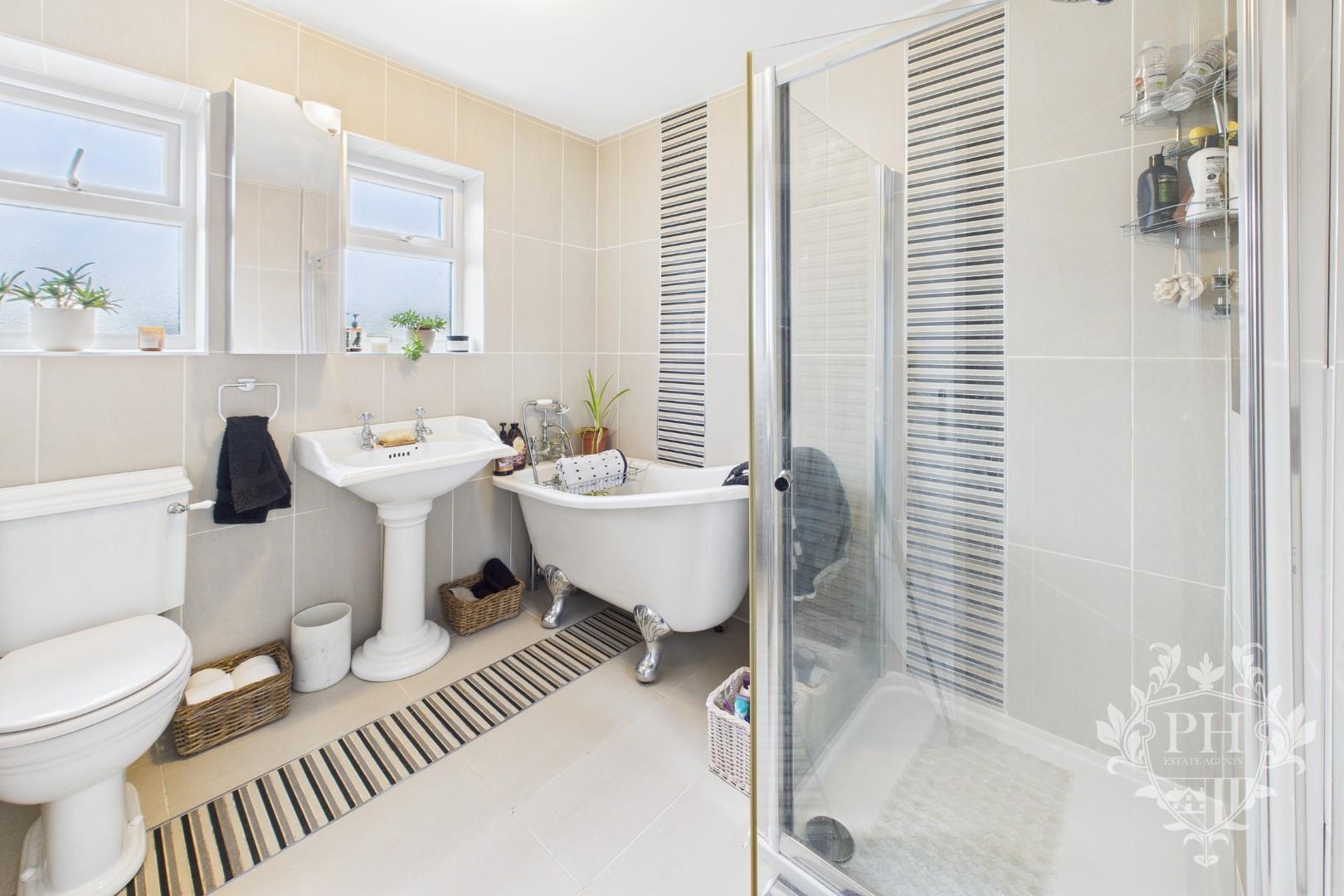 The family bathroom features a contemporary four-piece suite comprising a striking free-standing bath with elegant chrome legs, a separate shower cubicle fitted with a thermostatic shower, a hand basin, and a low-level WC. The space is further enhanced by modern wall and floor tiling, a fitted radiator, and a frosted UPVC double-glazed window that provides natural light while maintaining privacy.