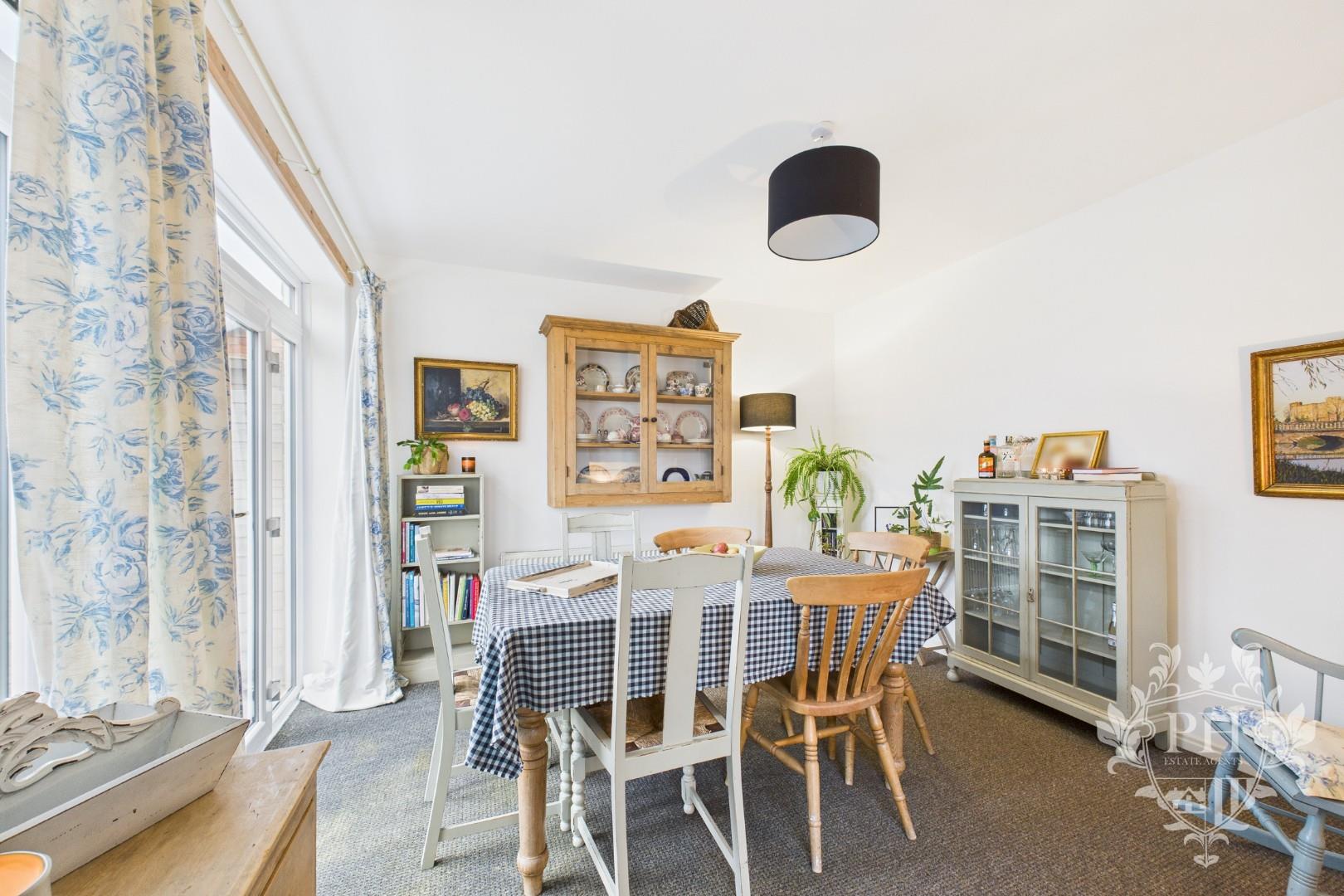 Open to the kitchen is the dining area, which provides ample space for a large dining table as well as additional storage units. This inviting space is further enhanced by French doors that open directly onto the rear patio, creating an ideal setting for both everyday living and entertaining.