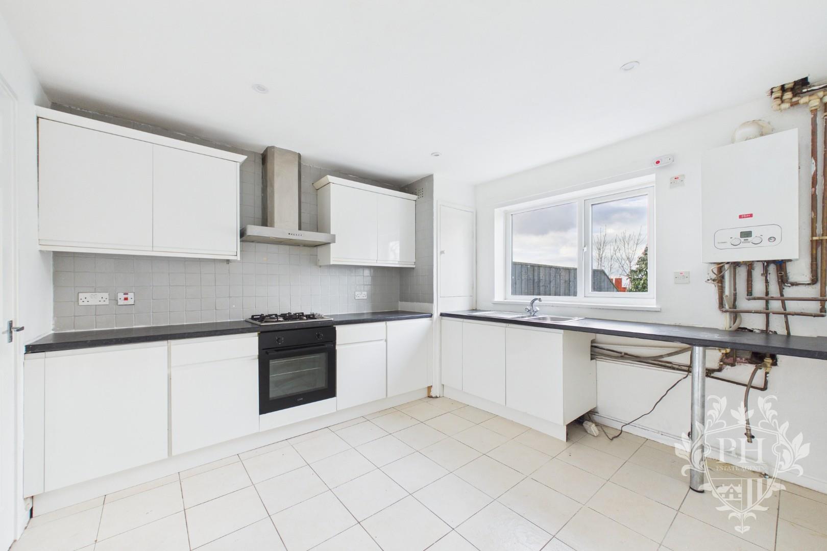 The kitchen is fitted with a stylish selection of sleek, white high-gloss wall cabinets, base units, and spacious drawers, all offset by striking dark countertops that offer plenty of room for meal prep. A built-in electric oven sits neatly below a ceramic hob, and there’s ample space designed for your choice of free-standing appliances. Natural light streams in through a large UPVC double-glazed window, while a radiator keeps the space cozy. The floor is finished with durable, easy-to-clean tiles that add both practicality and a polished look to the room.