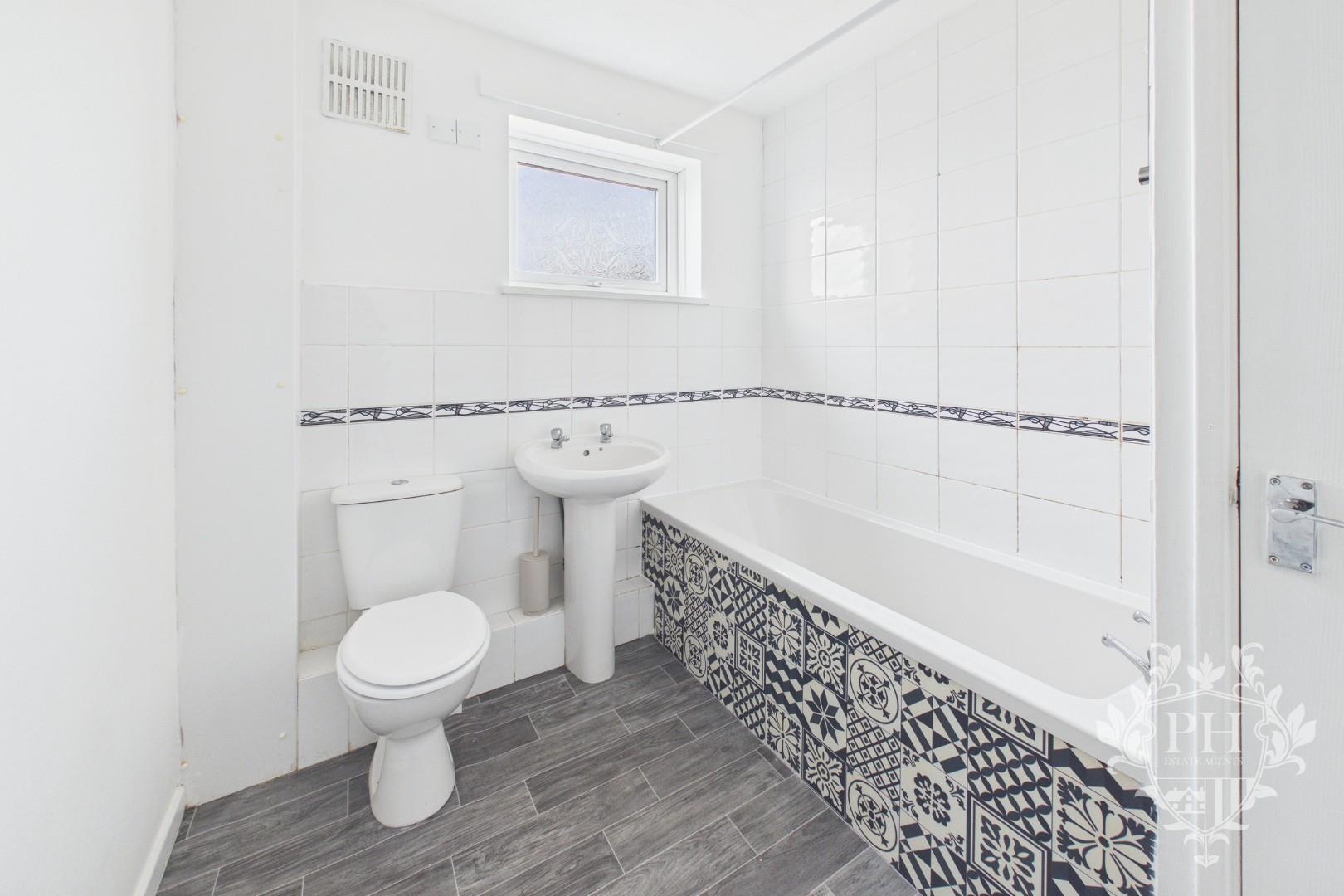 The family bathroom features a classic three-piece suite, including a deep, paneled bathtub fitted with convenient shower attachments for both quick rinses and leisurely soaks. A sleek hand basin sits nearby, paired with a modern low-level toilet. The space is finished with a full tile surround that adds both style and protection, while a frosted UPVC double-glazed window lets in natural light without compromising privacy. A wall-mounted radiator keeps the room cozy, and a built-in airing cupboard offers practical storage for towels and linens.