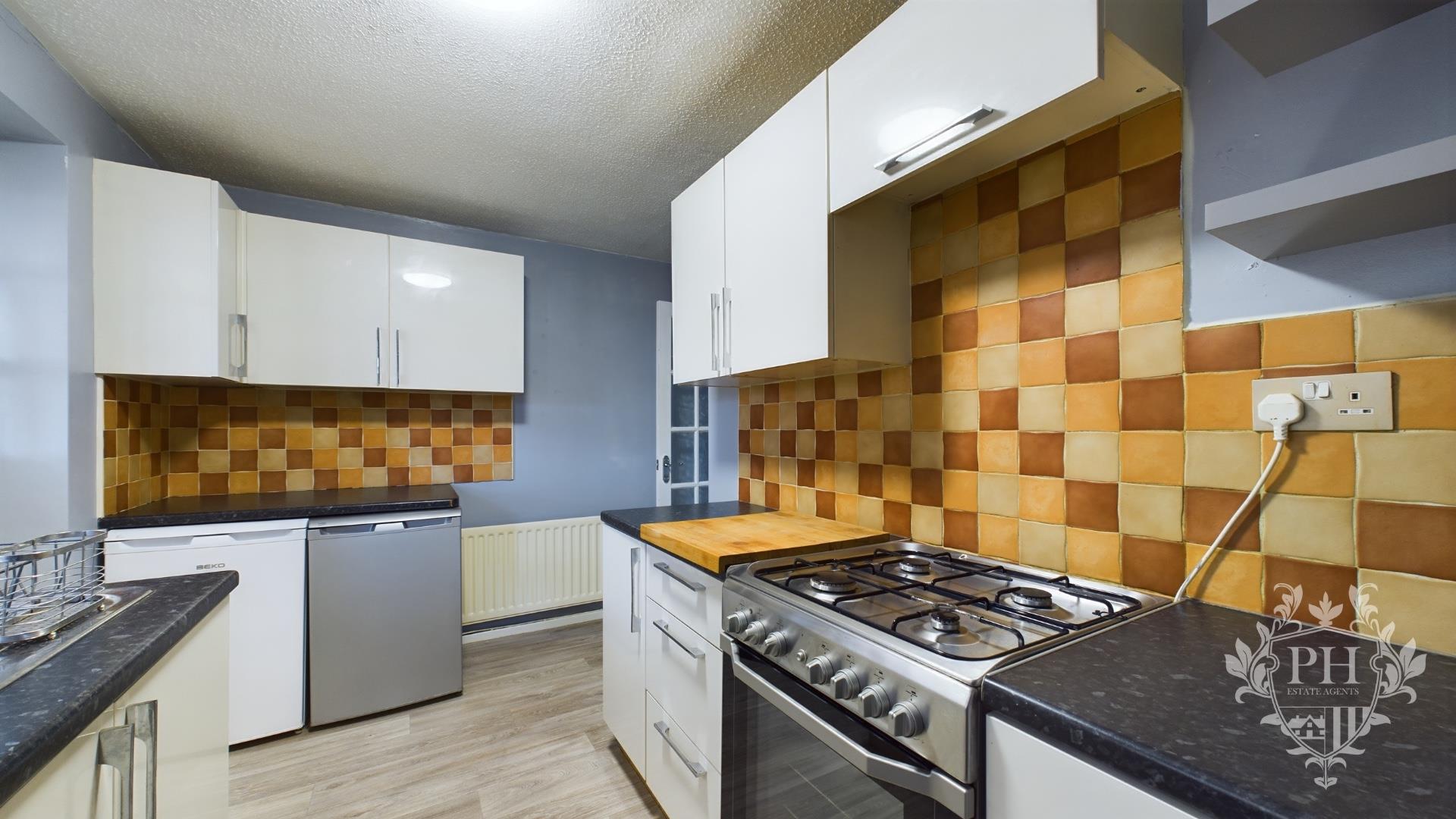 Step into a sleek, contemporary kitchen where high-gloss white cabinets catch the light at every angle. Elegant marble-effect countertops sweep across both wall-mounted and base units, creating the perfect stage for your culinary adventures. There's a dedicated space for your cooker, and the practical lino flooring means you won't have to stress about those inevitable cooking spills. A radiator keeps the space cosy year-round.