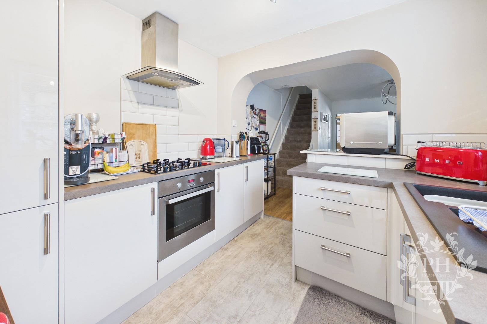 The kitchen has been thoughtfully renovated, featuring a generous selection of sleek, light-colored wall cabinets, base units, and deep drawers that brighten the entire space. Rich, dark countertops run the length of the cabinetry, creating a striking visual contrast and a modern feel. At the heart of the kitchen sits a built-in electric oven paired with a gas hob, complete with a stainless steel extractor fan overhead—perfect for both everyday meals and more ambitious cooking projects. The layout opens gracefully into the dining area, where you’ll find additional storage units and plenty of room for free-standing appliances. A large UPVC double glazed window and matching door flood the space with natural light while offering direct access to the rear yard, making indoor-outdoor living a breeze. There’s also a convenient doorway leading from the kitchen to the ground floor bathroom, ensuring both practicality and ease of movement throughout the home.