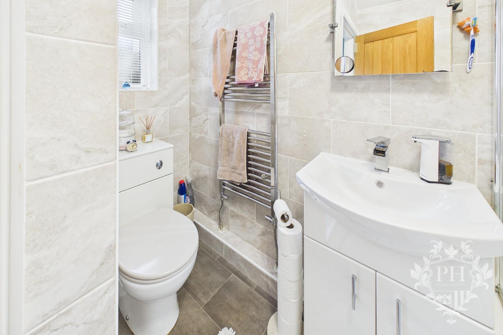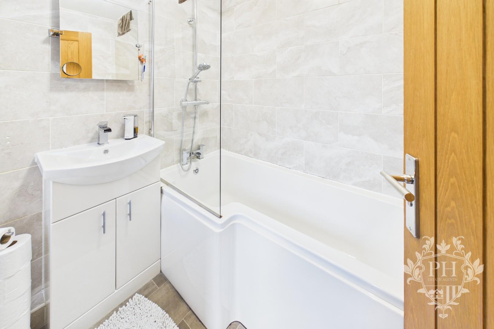 The ground floor bathroom features a stylish three-piece suite, centered around an L-shaped bath fitted with a thermostatic shower and a sleek glass screen that keeps water contained while adding a modern touch. A contemporary hand basin sits atop built-in storage, offering both practicality and a clean look, while the low level w.c. blends in seamlessly with the room’s design. The walls are finished with elegant tiles that wrap around the space, and a polished chrome radiator provides both warmth and a hint of luxury. Natural light filters softly through a frosted UPVC double glazed window, ensuring privacy without sacrificing brightness.