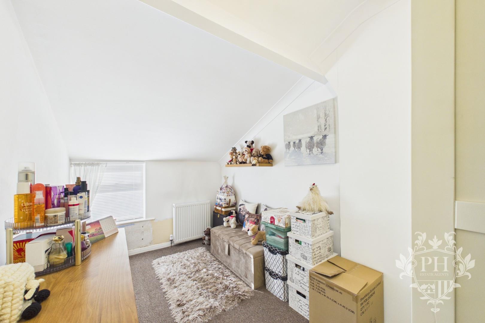 The third bedroom sits at the front of the house, its window catching the morning light. At the moment, it serves as a combined storage and dressing area, but there's easily enough space to fit a single bed along with extra storage furniture. The room features a modern UPVC double glazed window that keeps things quiet and cozy, a radiator to keep you warm, and a built-in wardrobe tucked neatly against one wall, providing convenient storage without crowding the space.